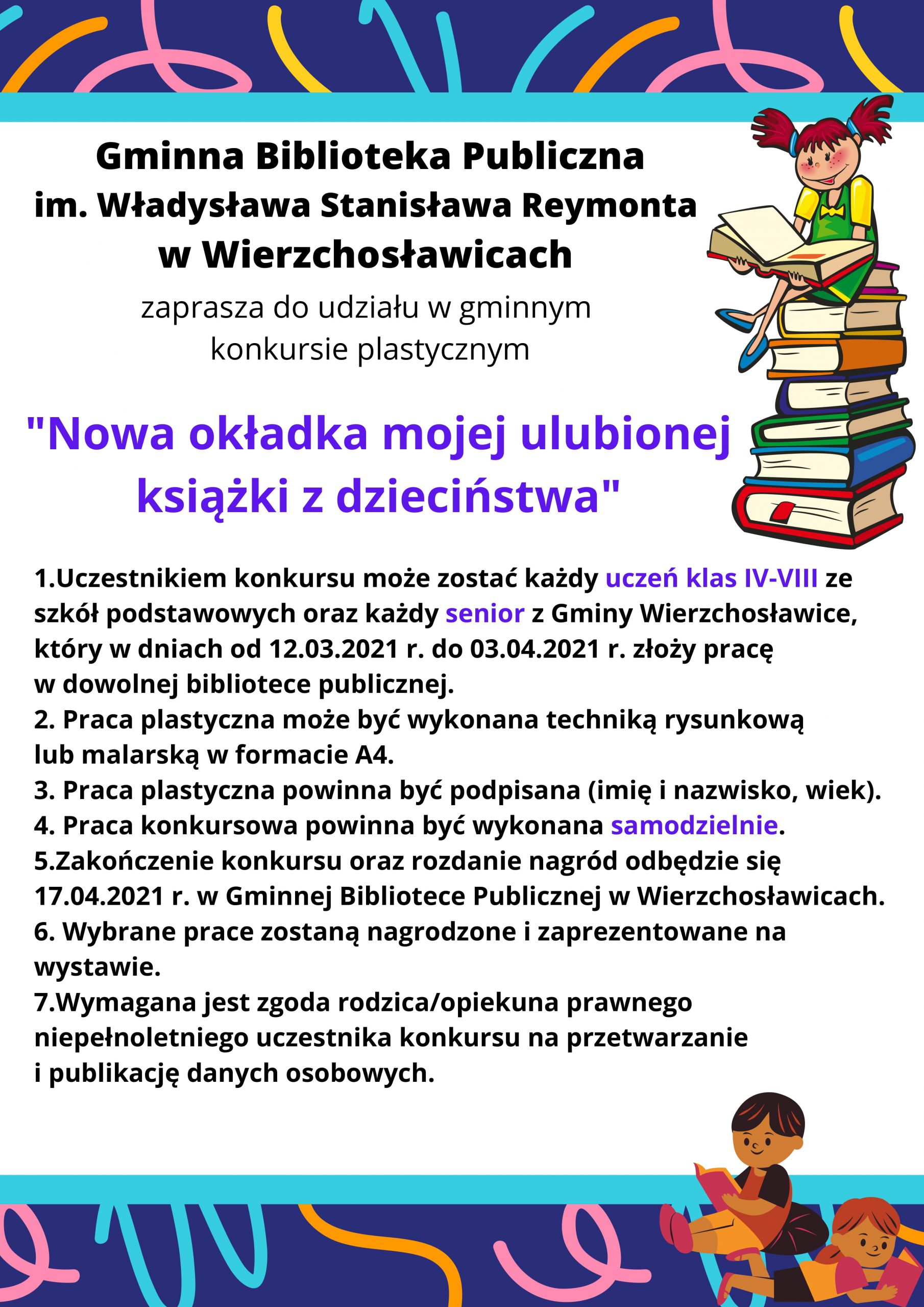 Co roku 2 kwietnia obchodzimy Międzynarodowy Dzień Książki dla Dzieci. Z tej okazji ogłaszamy konkurs plastyczny dla uczniów klas IV-VIII szkół podstawowych oraz seniorów z gminy Wierzchosławice. Zapraszamy do udziału 🙂
