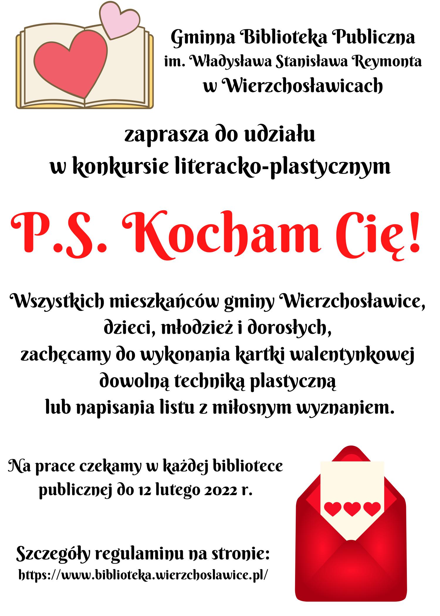 Gminna Biblioteka Publiczna im. Władysława Stanisława Reymonta w Wierzchosławicach zaprasza do udziału w konkursie literacko-plastycznym P.S. Kocham Cię!