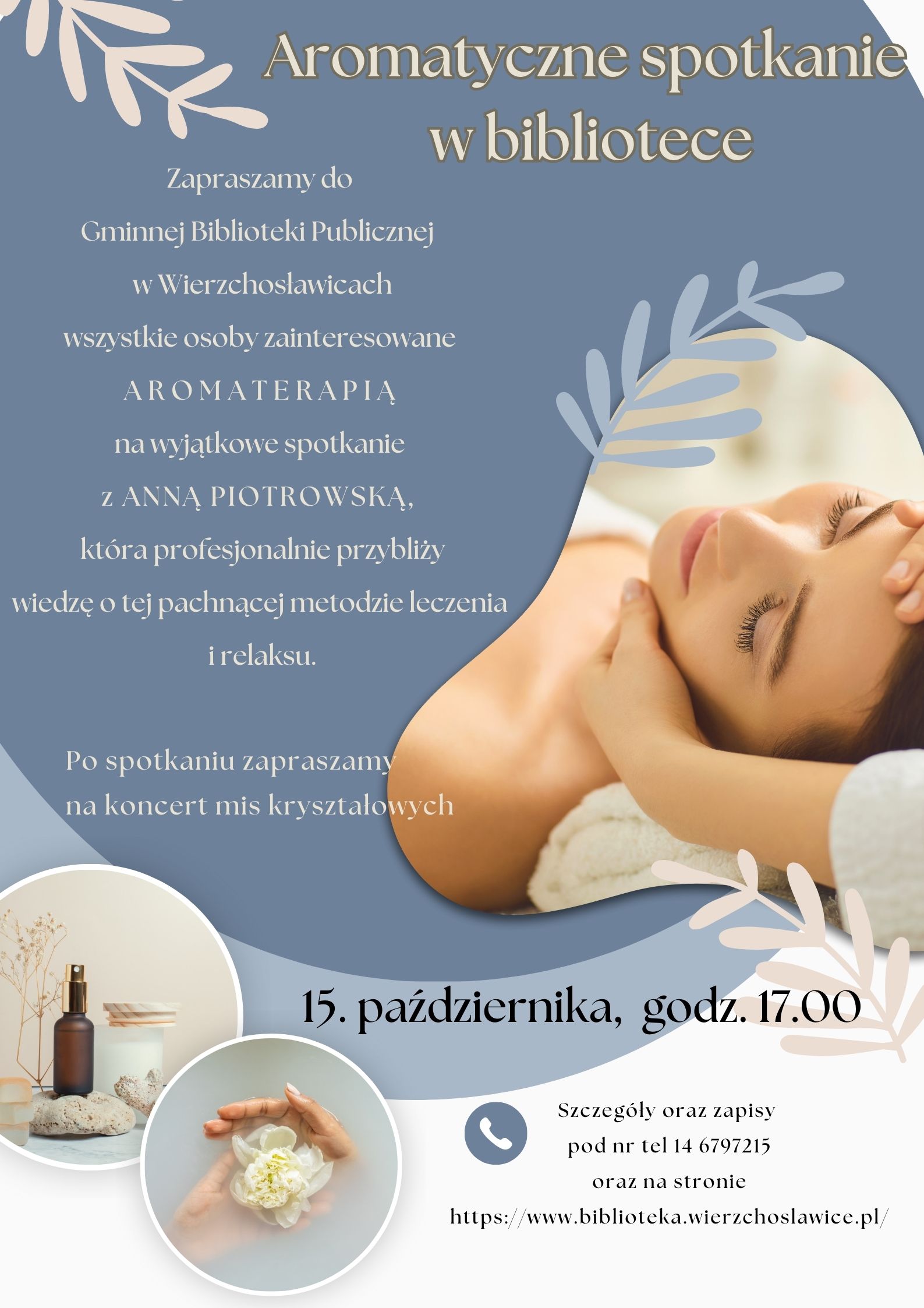 Serdecznie zapraszamy na Aromatyczne spotkanie w Gminnej Bibliotece Publicznej w Wierzchosławicach 15. października 2024 r. na godz. 17.00. Spotkanie poprowadzi Anna Piotrowska, która też przygotowała dla Was zaproszenie 🙂