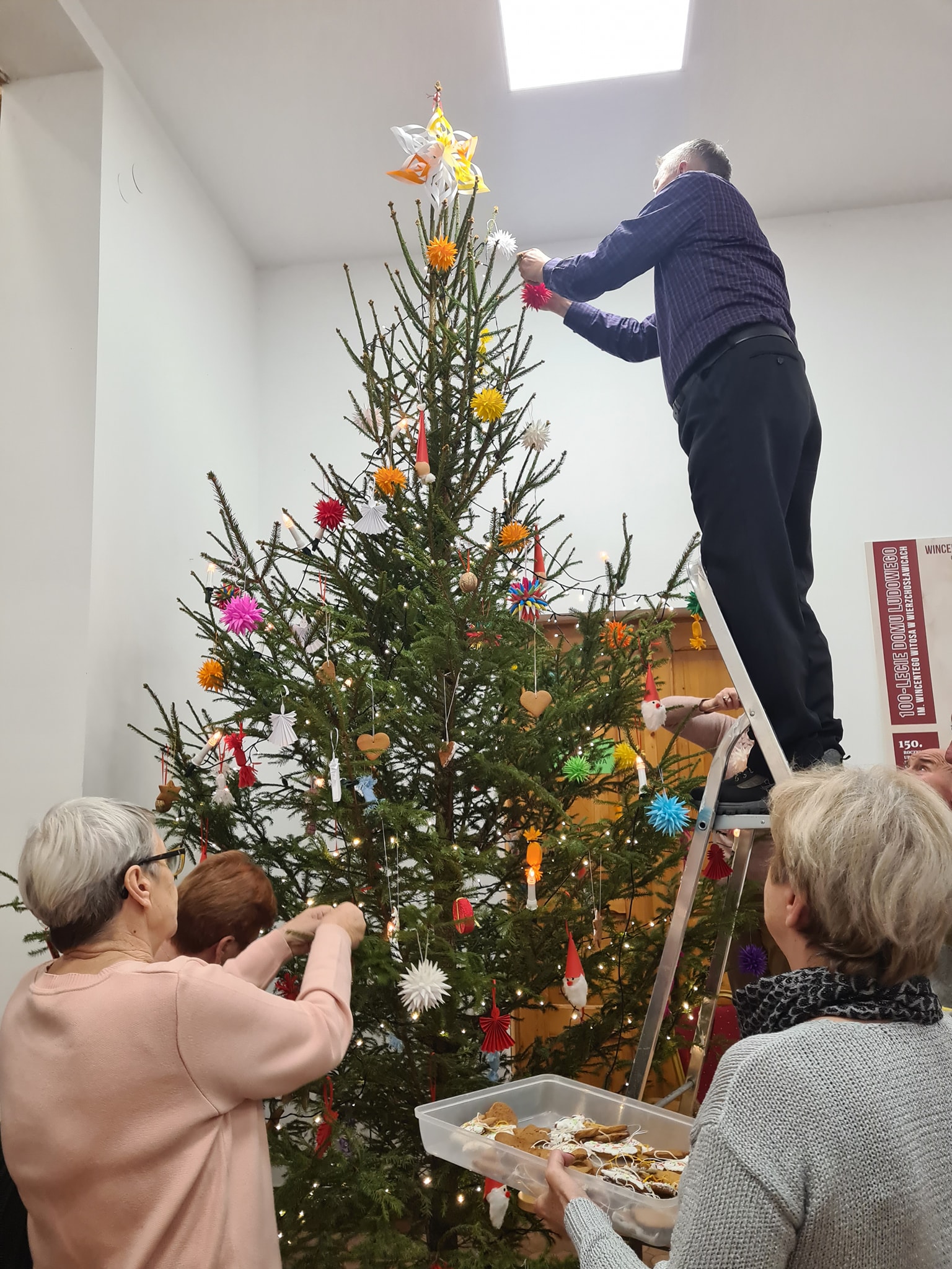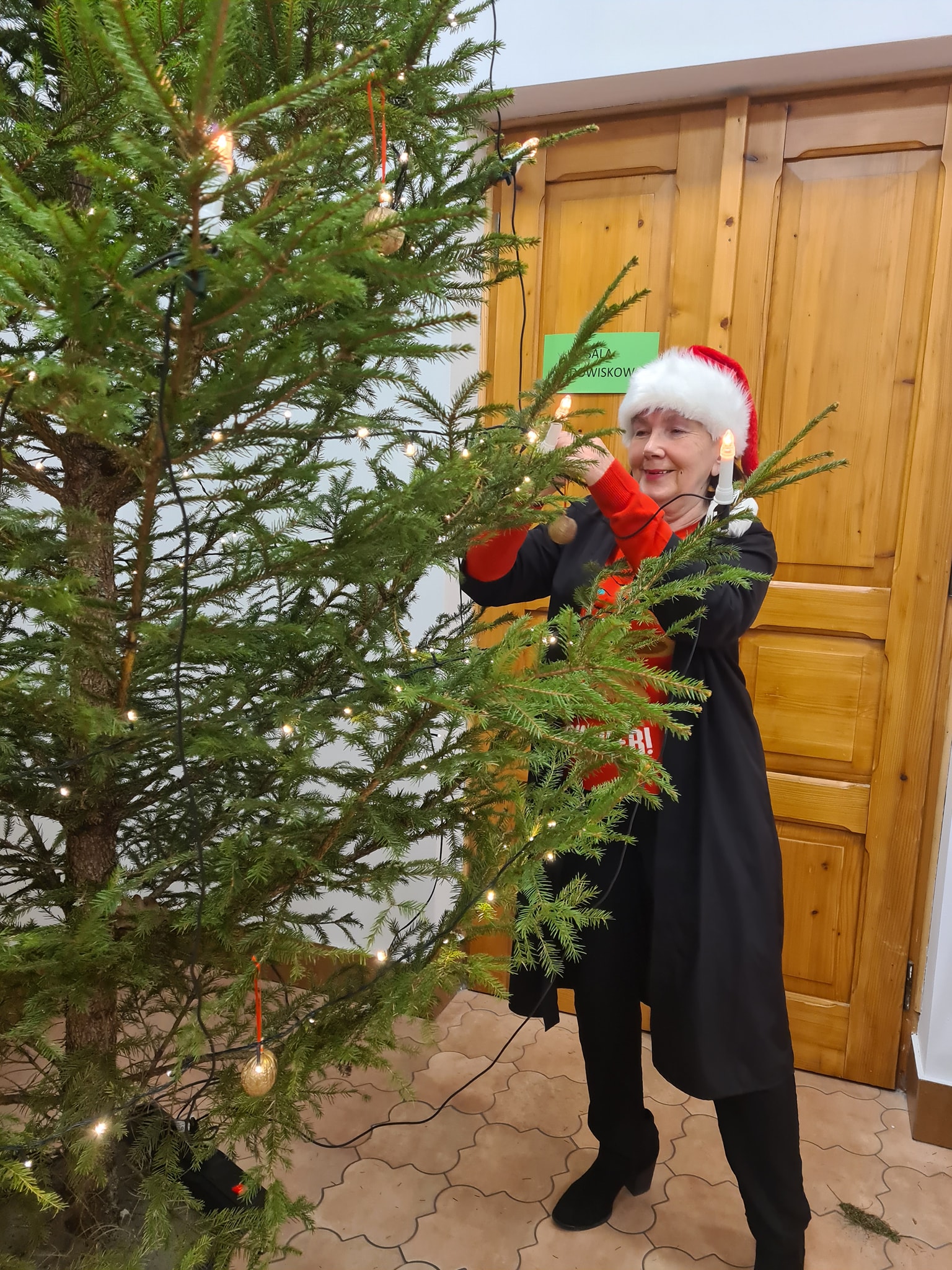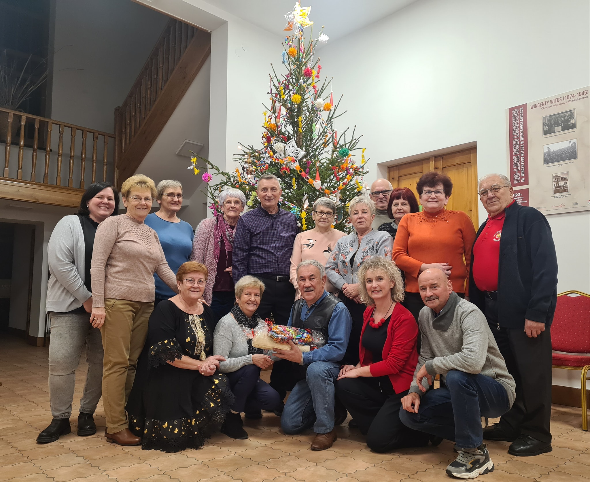Seniorzy z Klubu Senior + oraz Stowarzyszenie Klub Seniora Przystań w Wierzchosławicach przygotowali przepiękne ozdoby, które wieszali na swoich choinkach w dzieciństwie. Na naszym drzewku zawiesiliśmy długie papierowe łańcuchy, kolorowe jeżyki, Mikołaje z wydmuszek, mnóstwo cukierków owiniętych w serwetki, pierniki, malowane orzechy i migoczące światełka.