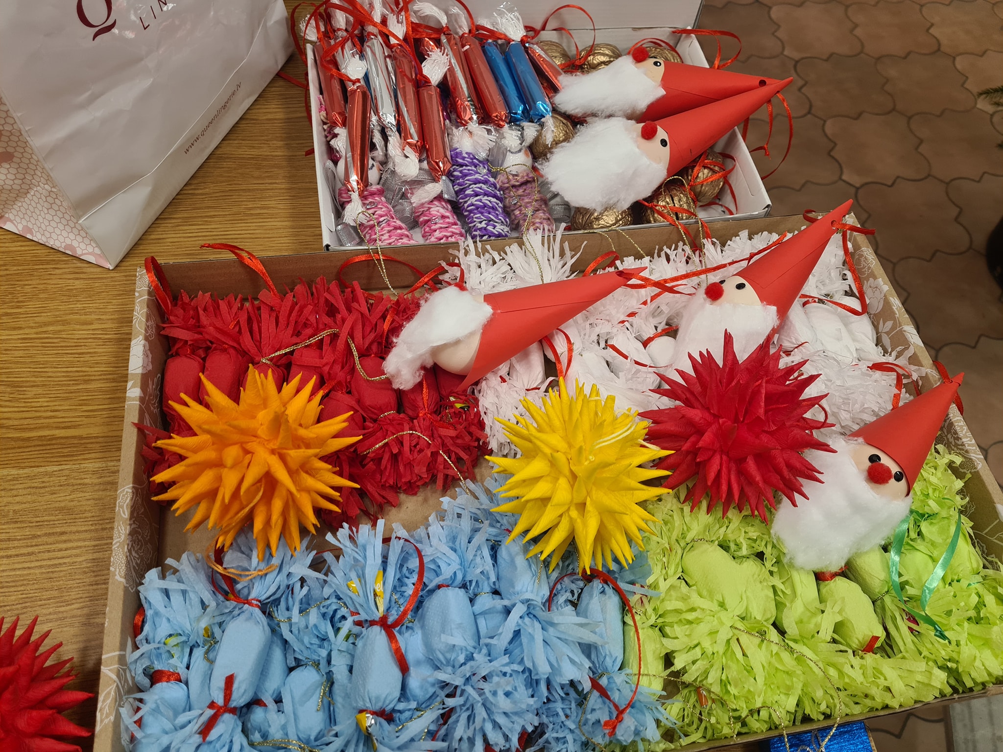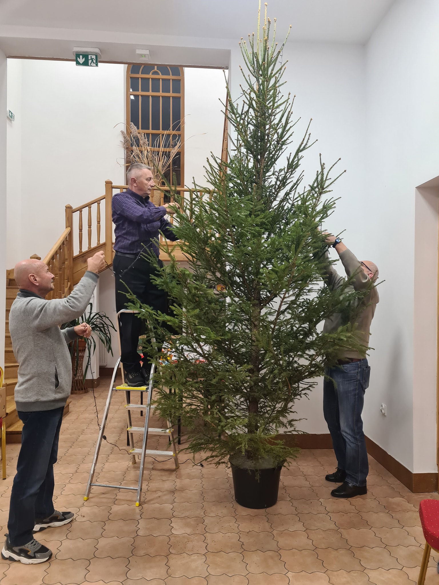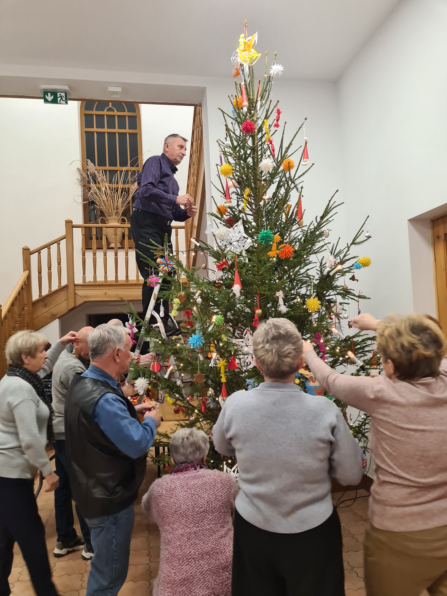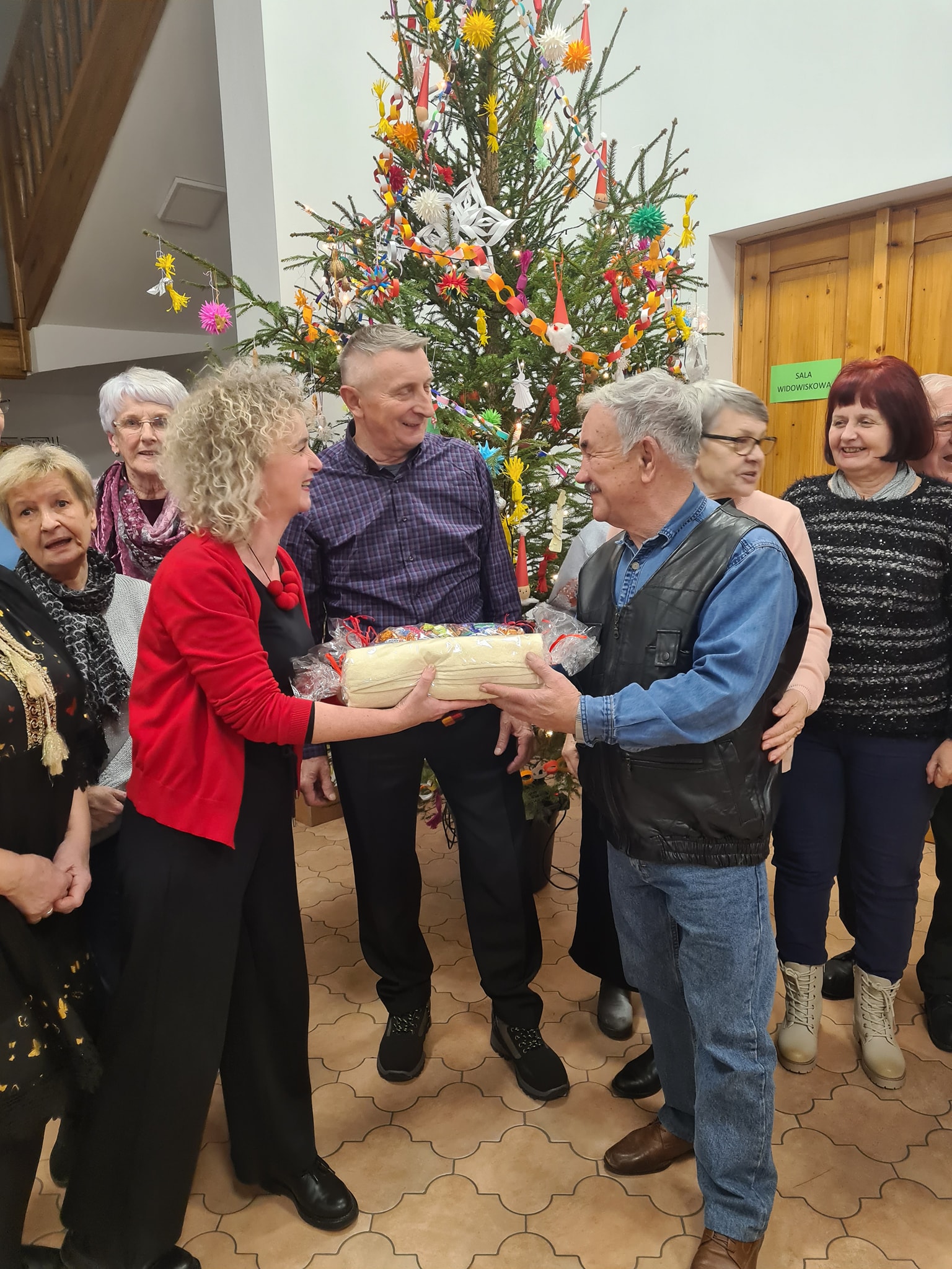 Seniorzy z Klubu Senior + oraz Stowarzyszenie Klub Seniora Przystań w Wierzchosławicach przygotowali przepiękne ozdoby, które wieszali na swoich choinkach w dzieciństwie. Na naszym drzewku zawiesiliśmy długie papierowe łańcuchy, kolorowe jeżyki, Mikołaje z wydmuszek, mnóstwo cukierków owiniętych w serwetki, pierniki, malowane orzechy i migoczące światełka.