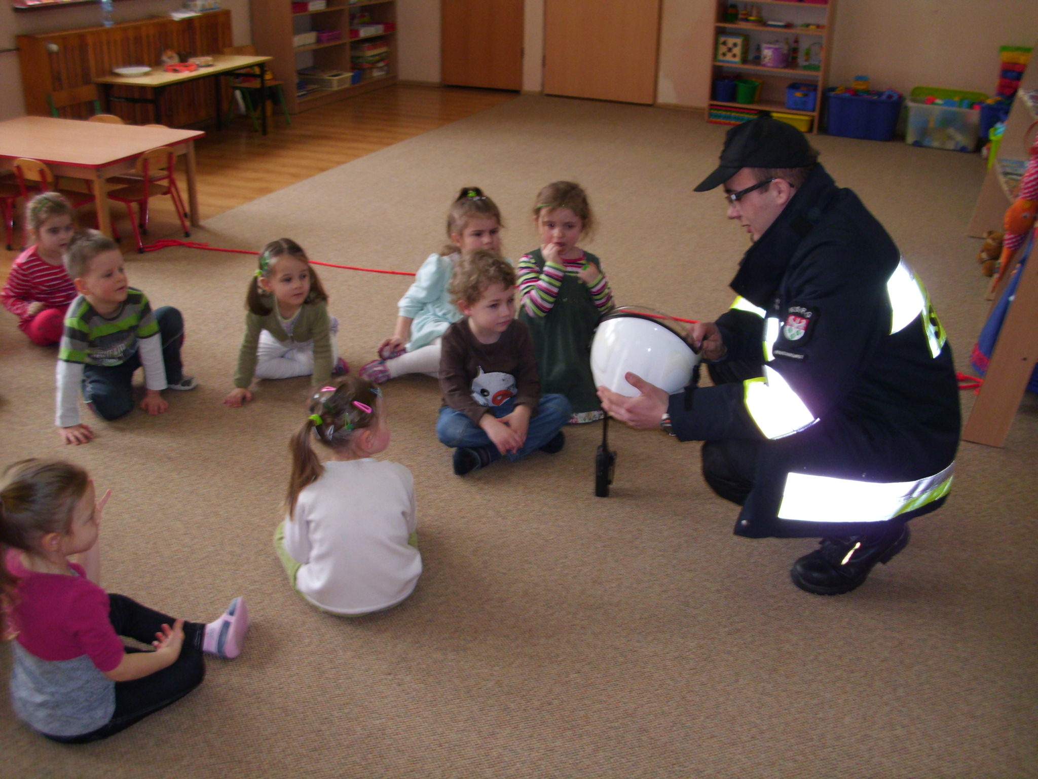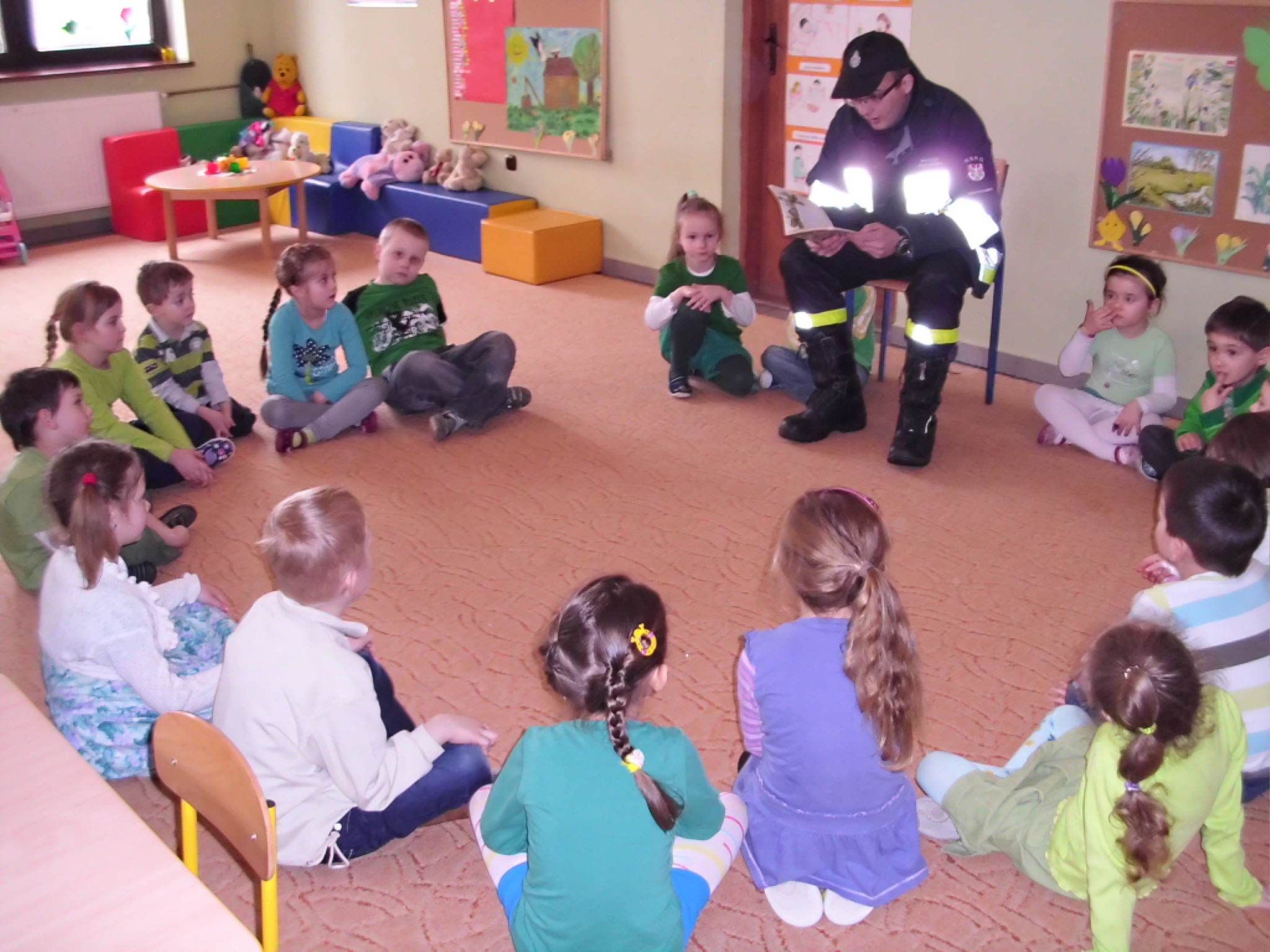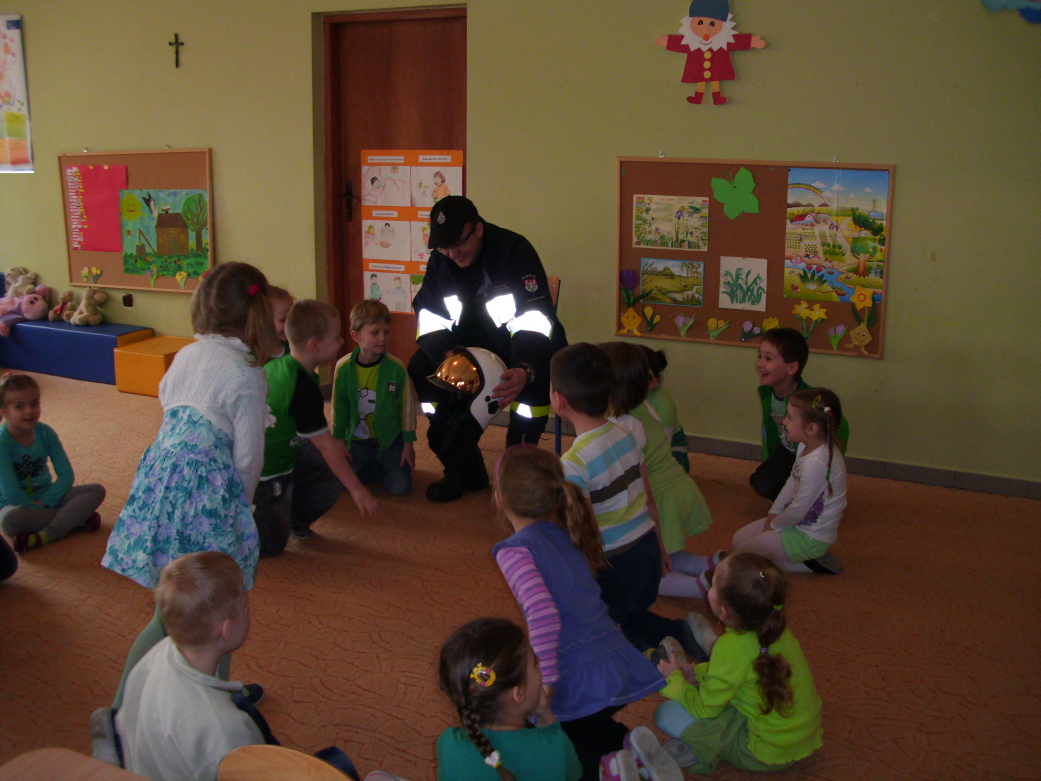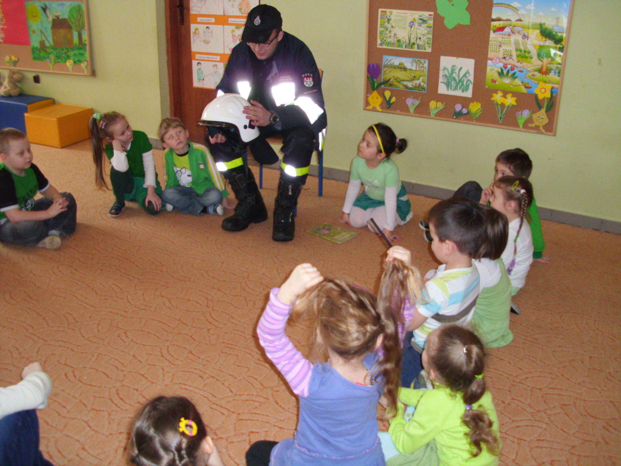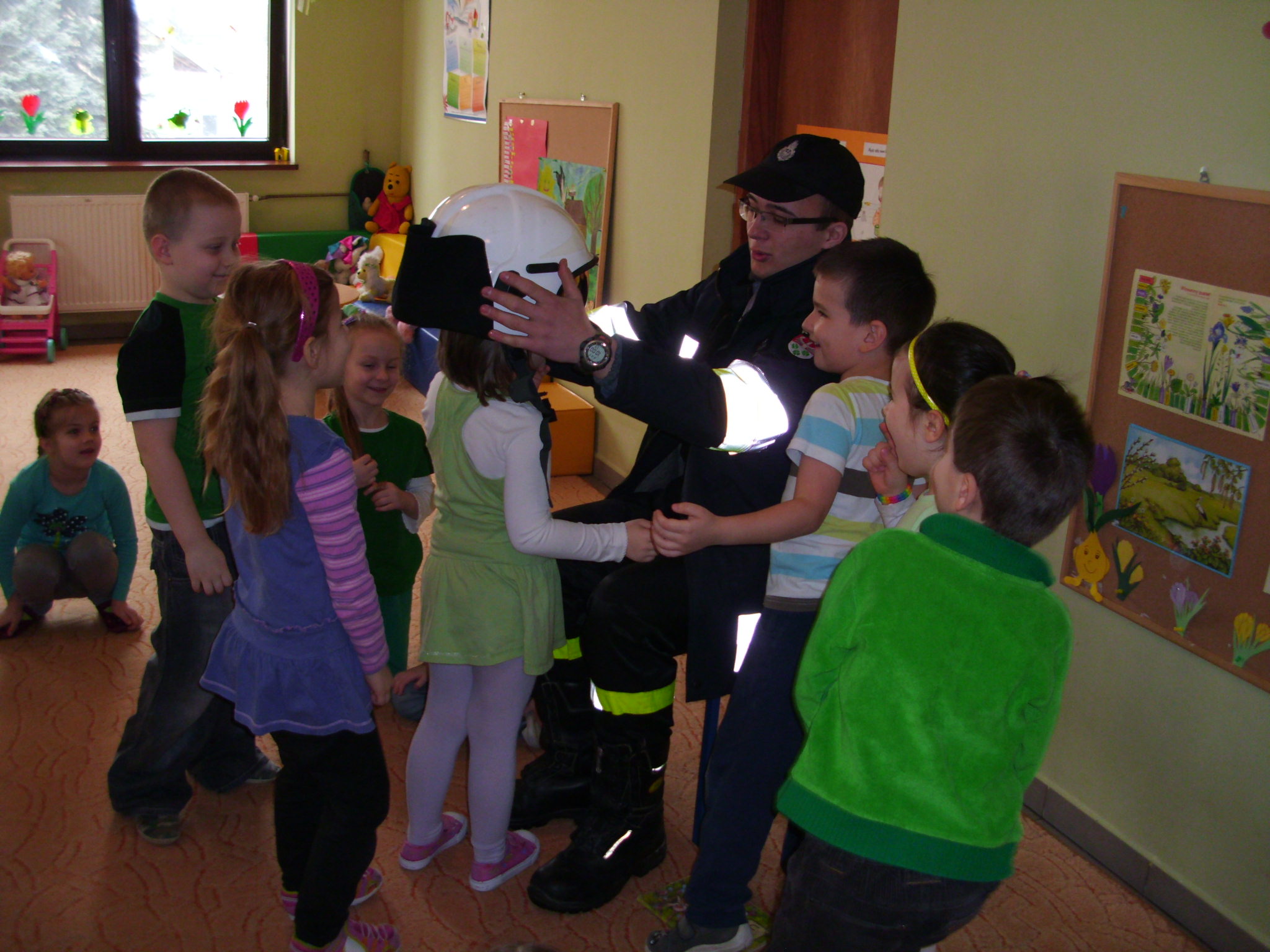 Na kolejnym spotkaniu w przedszkolu pan Mateusz Krakowski, strażak z Ochotniczej Straży Pożarnej w Wierzchosławicach, czytał dzieciom wiersz Juliana Tuwima „Trudny rachunek”. Potem opowiadał  o mundurze i wyposażeniu strażaka. Dzieci oglądały radiotelefon i chętnie przymierzały strażacki kask, zadawały wiele pytań o sprzęt i o to, kto może zostać strażakiem.