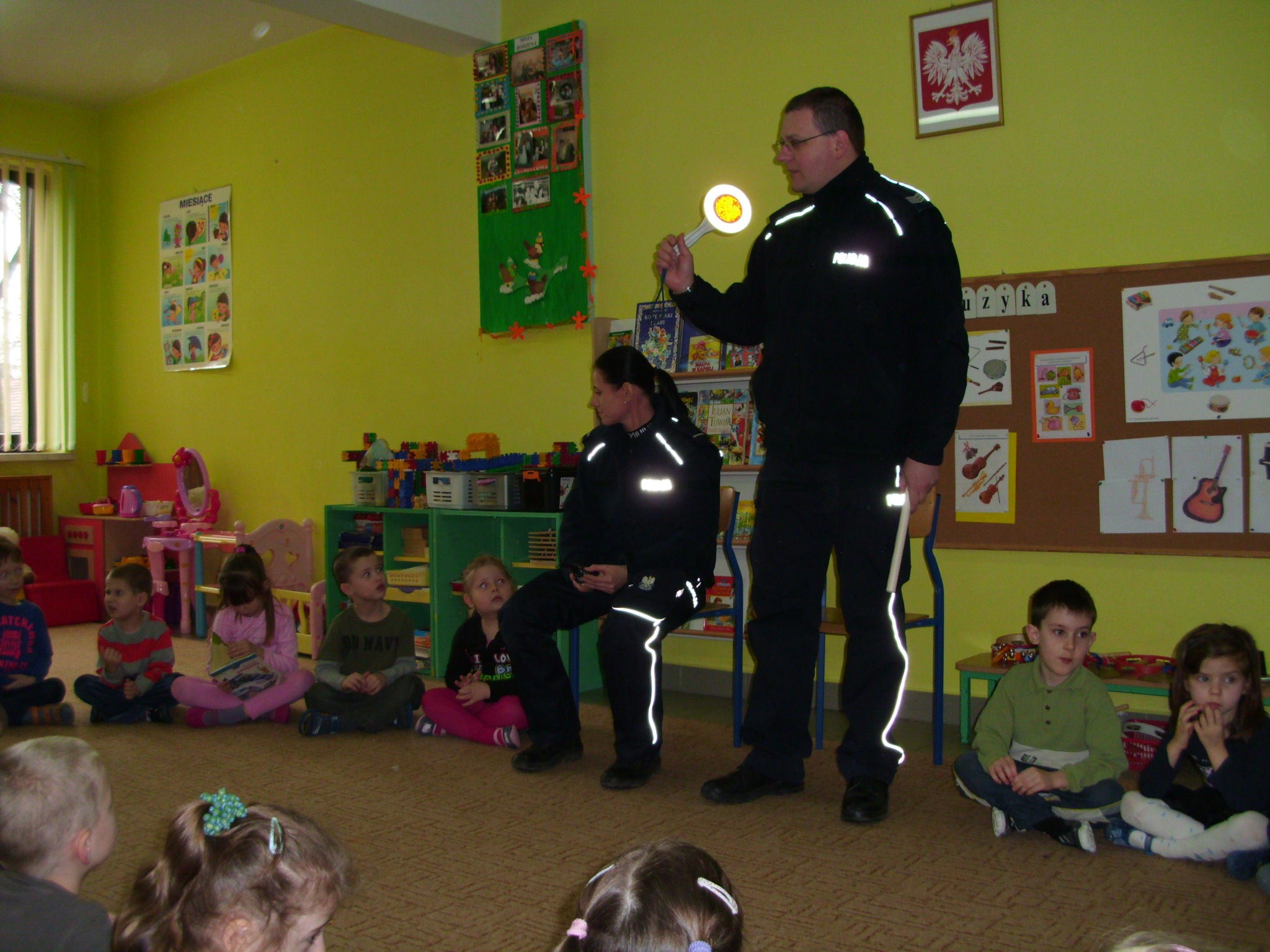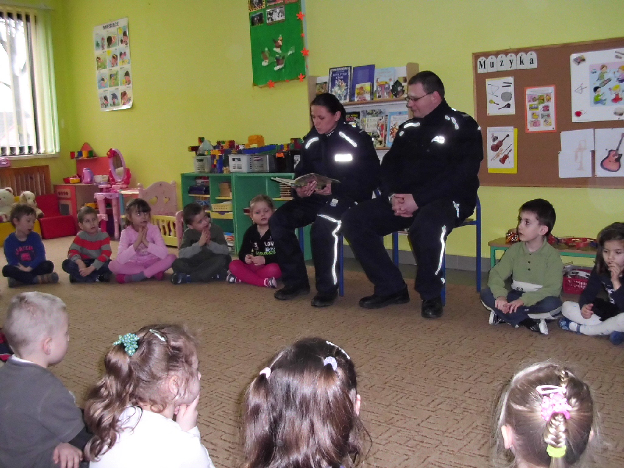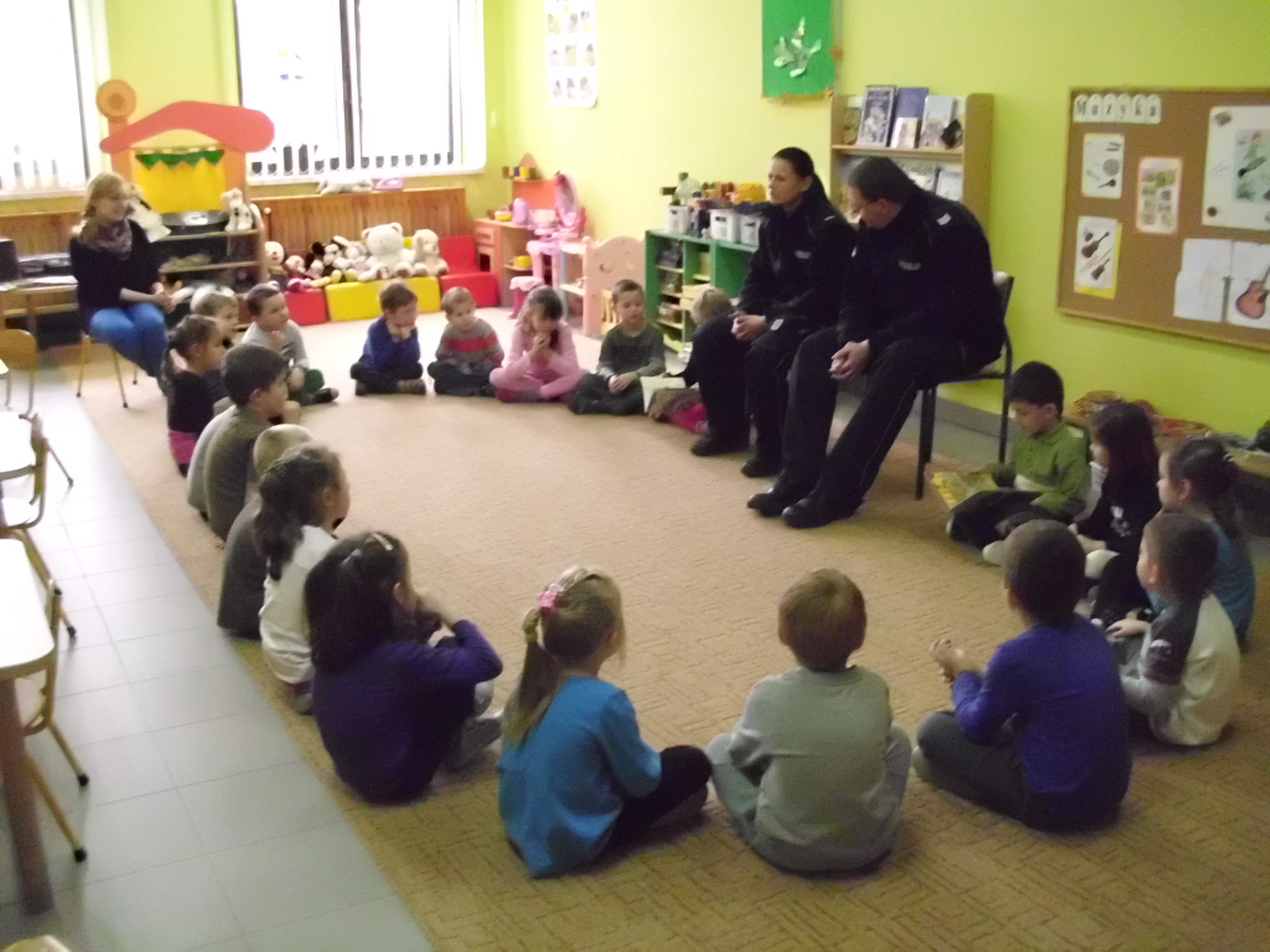 Pani policjantka przeczytała dzieciom Lokomotywę Juliana Tuwima. Przedszkolaki z zainteresowaniem słuchały opowieści funkcjonariuszy o pracy policjanta, oglądały elementy wyposażenia i zgadywały jego przeznaczenie. Dzieci chętnie włączyły się do rozmowy, wypytując o szczegóły.  Brzydka pogoda uniemożliwiła obejrzenie z bliska radiowozu, ale pomocne okazały się książeczki ilustrujące pracę policji.