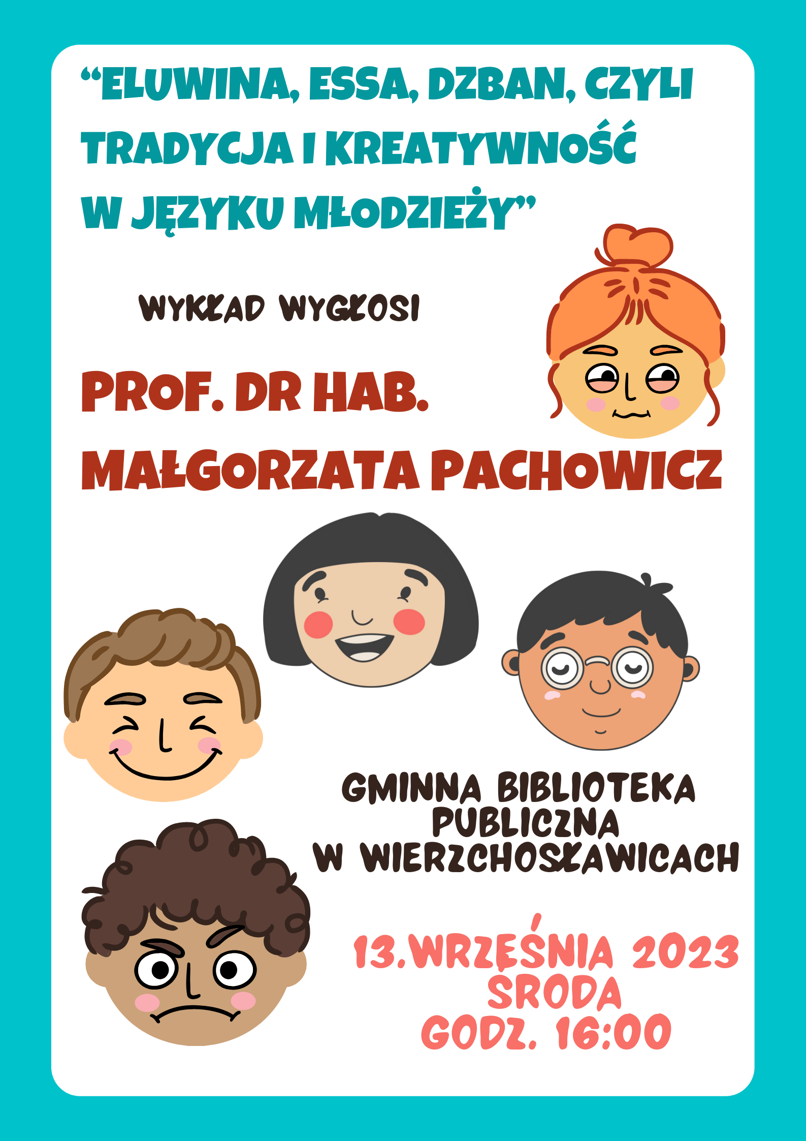 Gminna Biblioteka Publiczna im. W. S. Reymonta w Wierzchosławicach serdecznie zaprasza Nauczycieli, Rodziców, Opiekunów młodzieży w wieku szkolnym oraz wszystkich językowych entuzjastów na wykład pt.„Eluwina, essa, dzban, czyli tradycja i kreatywność w języku młodzieży”, który wygłosi prof. dr hab. Małgorzata Pachowicz, kierownik Katedry Filologii Polskiej w Akademii Nauk Stosowanych w Tarnowie. Wydarzenie odbędzie się 13. września (środa) o godzinie 16:00 w sali głównej Domu Ludowego Wincentego Witosa w Wierzchosławicach.