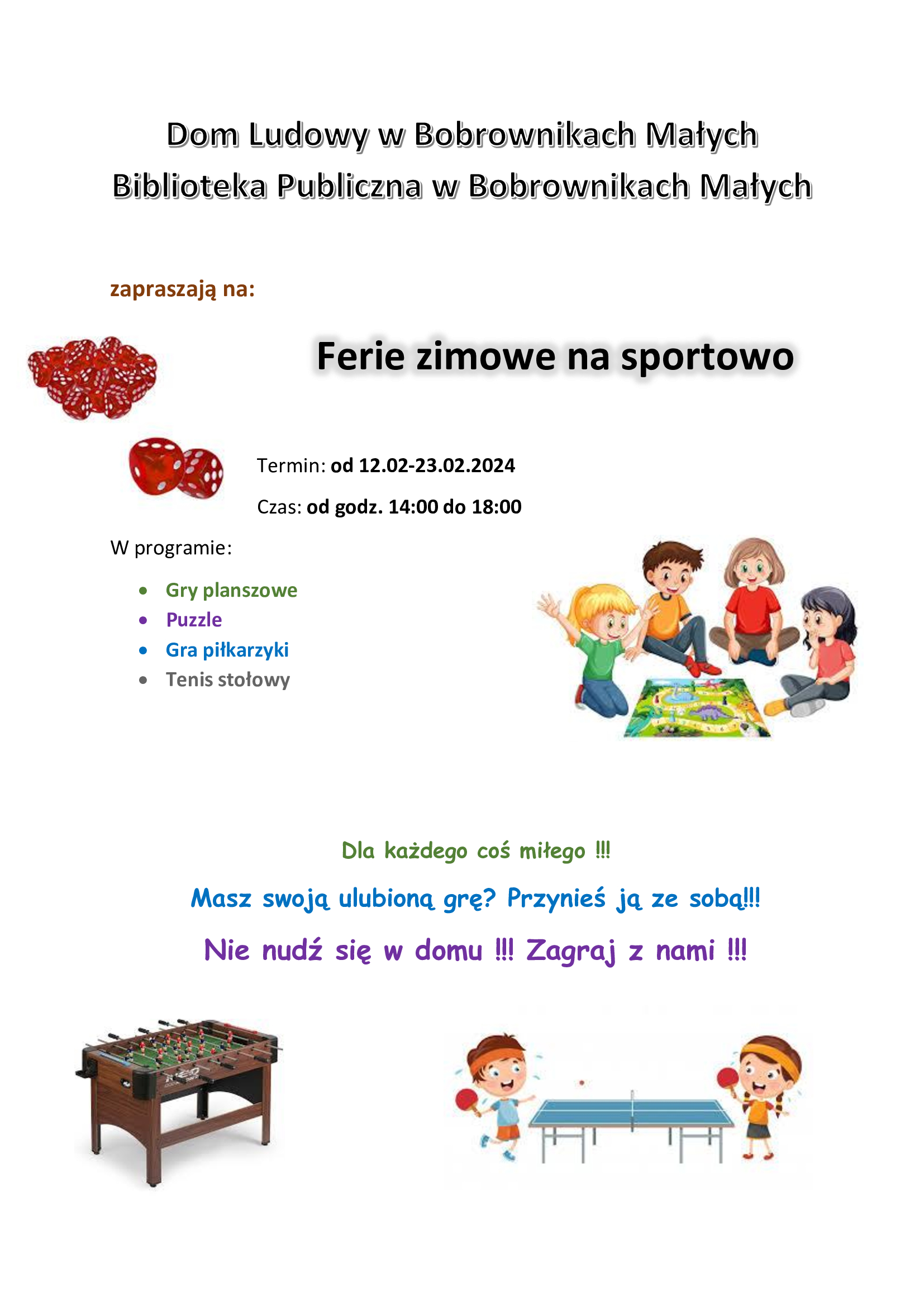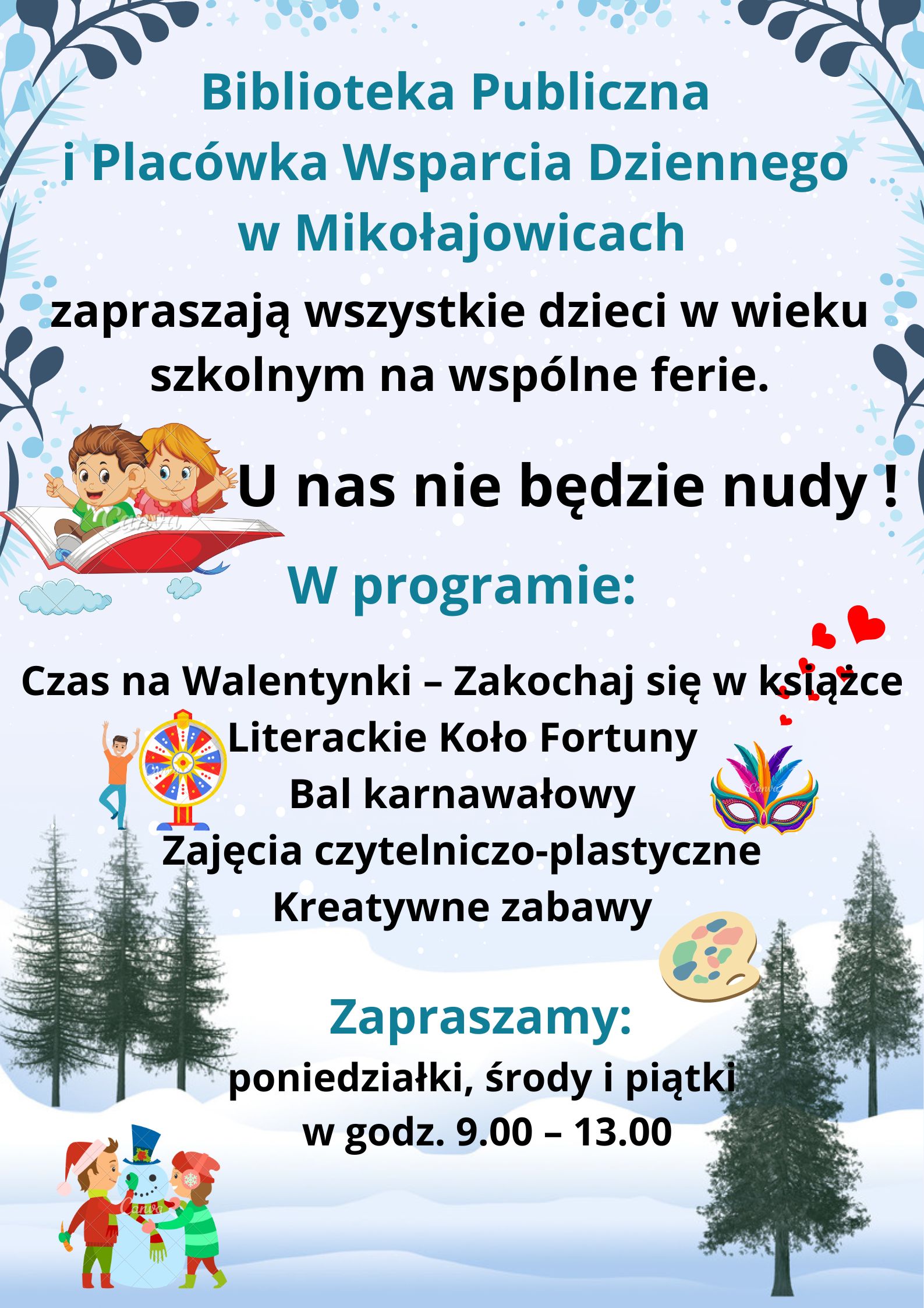 Ferie w filiach bibliotecznych opublikowany wAktualności w 2 lutego 2024 przez Redaktor Udostępnij Tweet Zapraszamy na zajęcia organizowane w czasie ferii przez nasze Filie w Bobrownikach Małych i Mikołajowicach Szczegóły poniżej —>