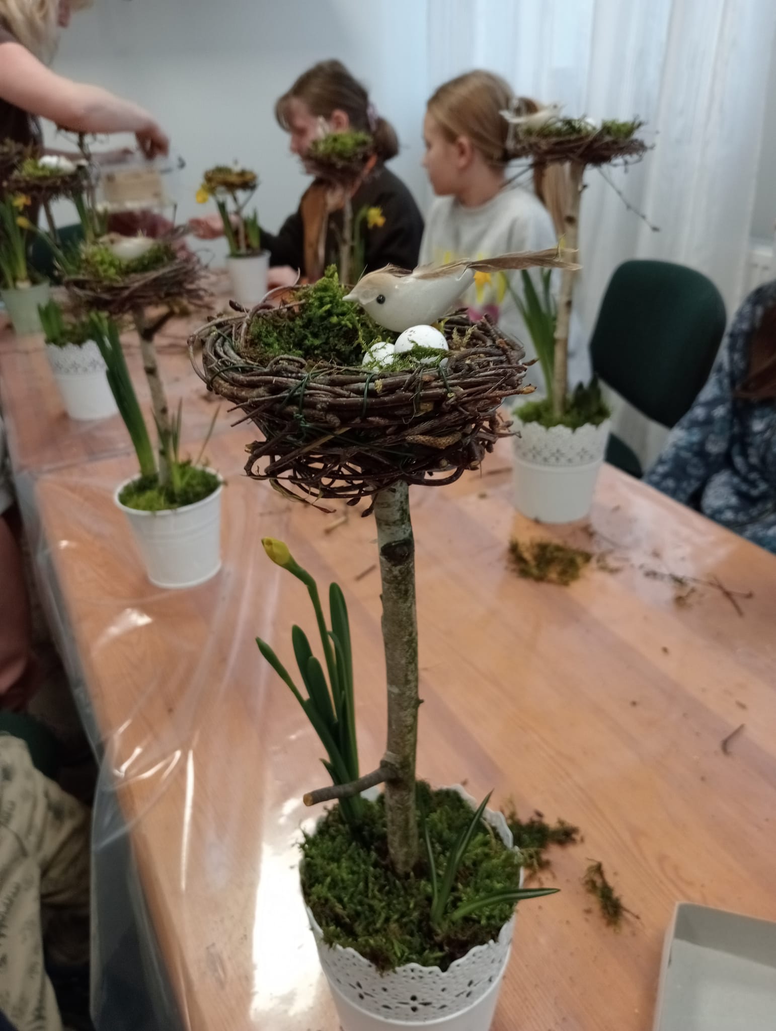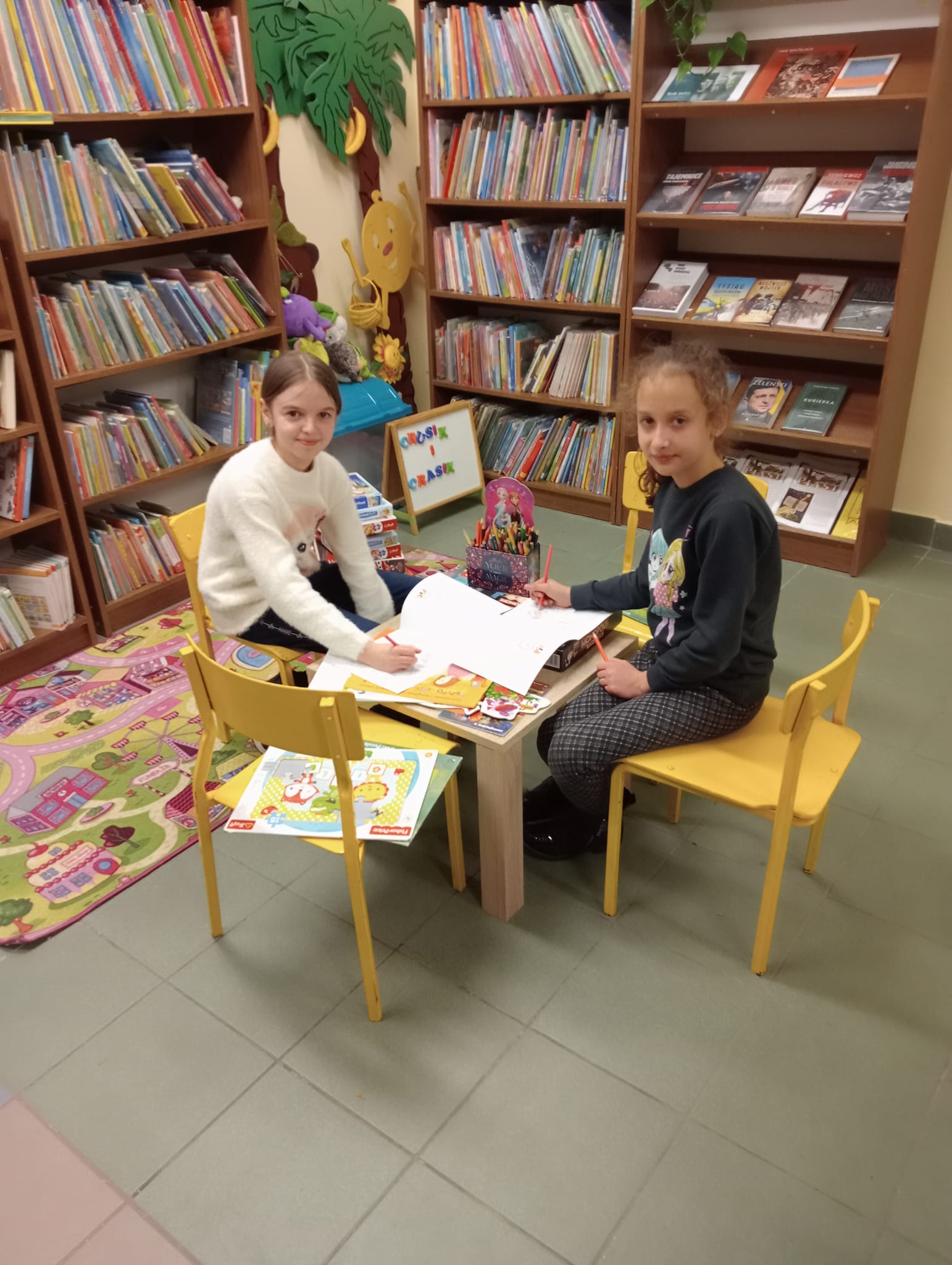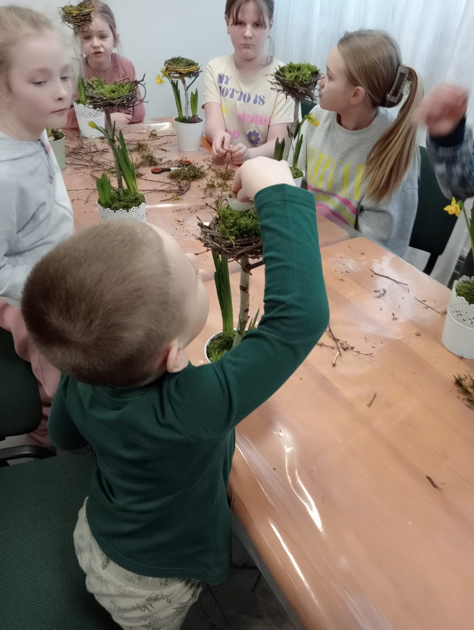 Dziewczynka układa puzzle przy stoliku w bibliotece Dzieci grają w ping-ponga na stole tenisowym Dwóch chłopców gra w piłkarzyki Dziewczynki rysują przy stoliczku w bibliotece Dwie dziewczynki układają puzzle na dywaniku w bibliotece Dzieci grają w ping-ponga przy stole tenisowym Dziecko umieszcza jajeczka w gniazdku, jako zwieńczenie kompozycji wiosennej Dzieci tną gałązki na gniazdka na warsztatach florystycznychWiosenna kompozycja, która powstała podczas warsztatów florystycznych