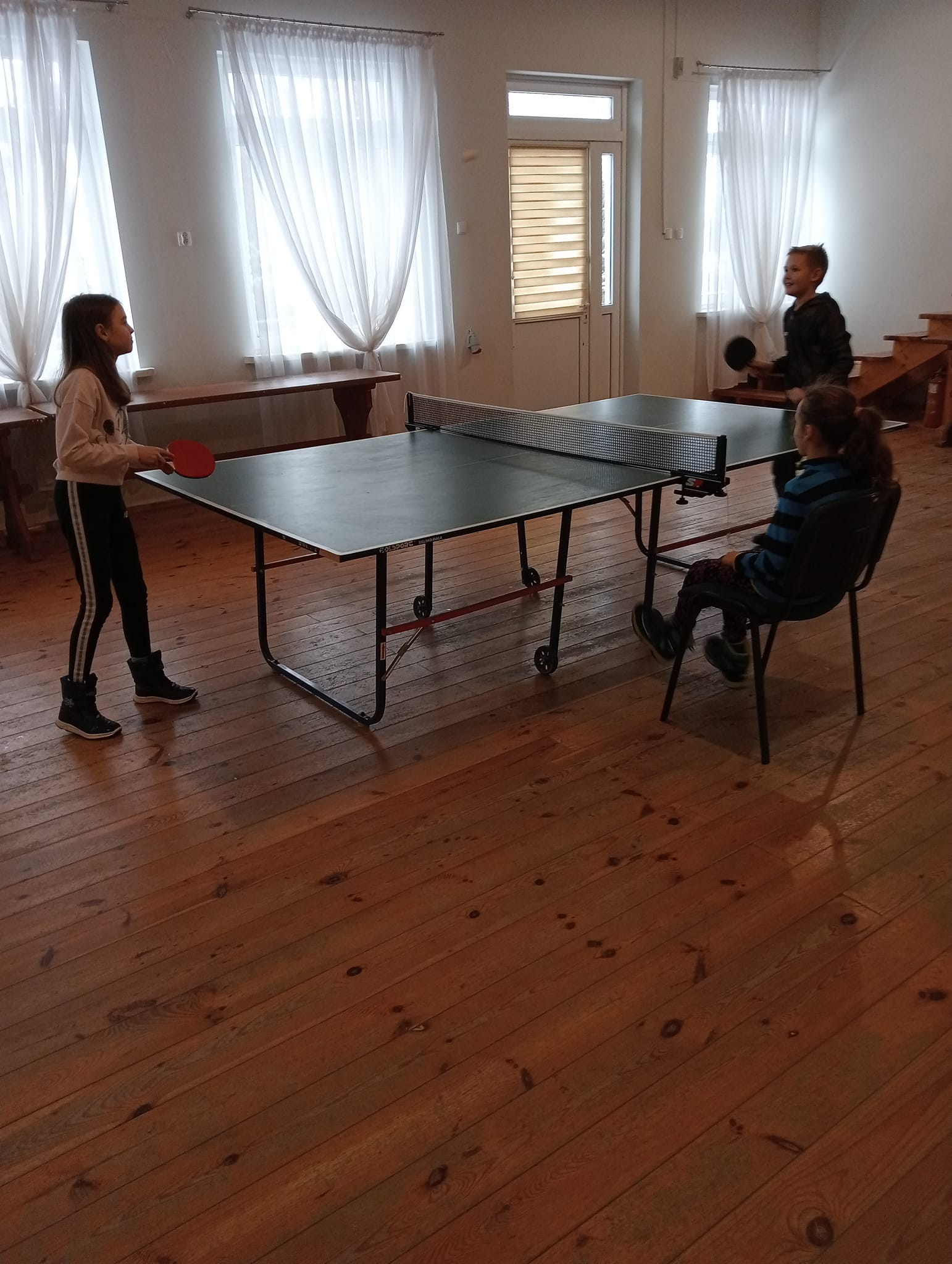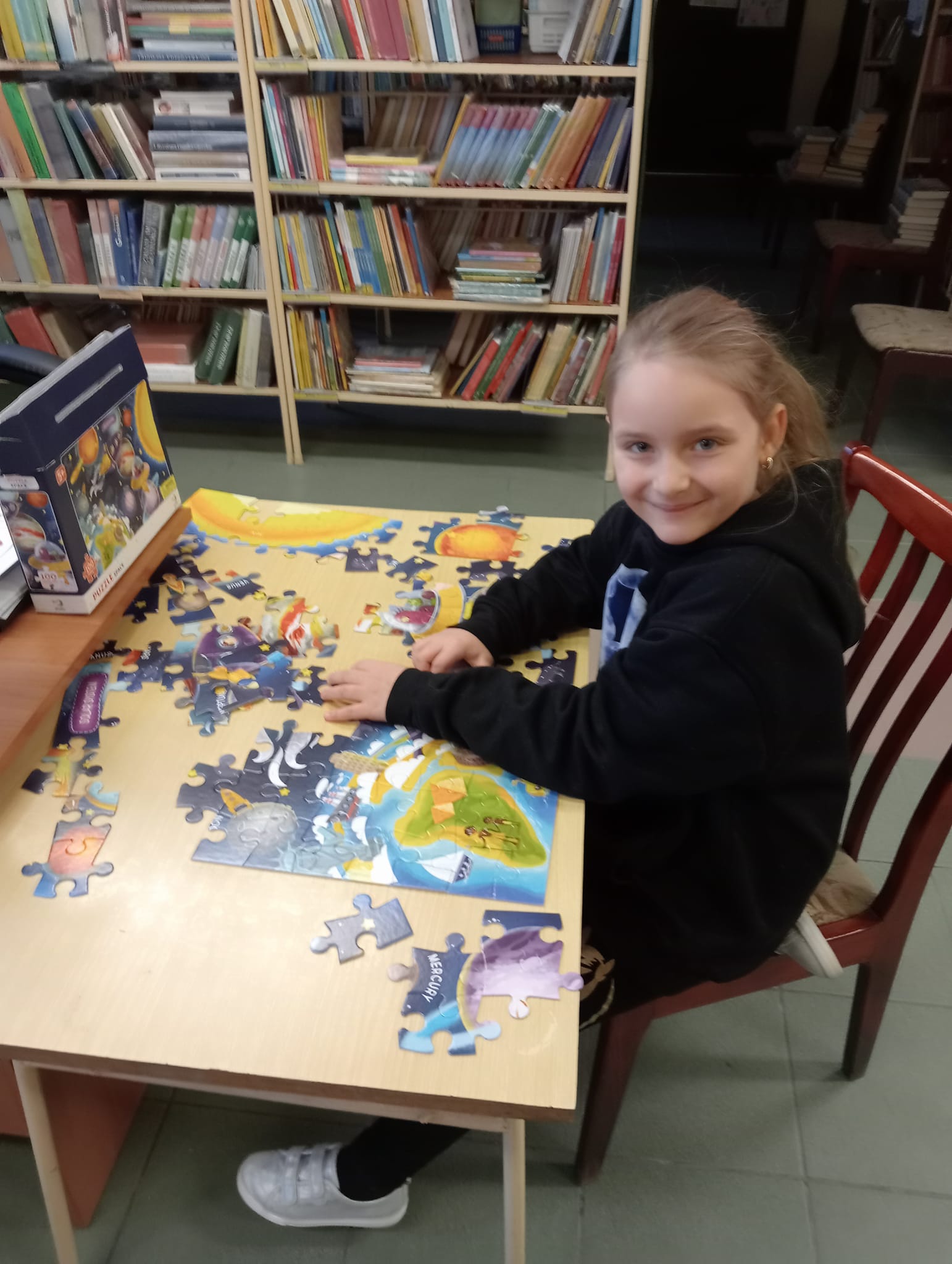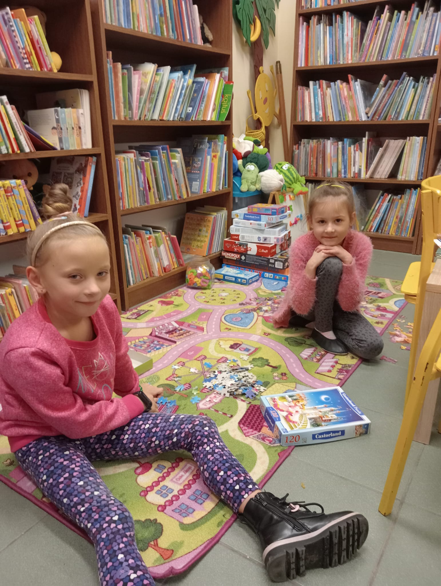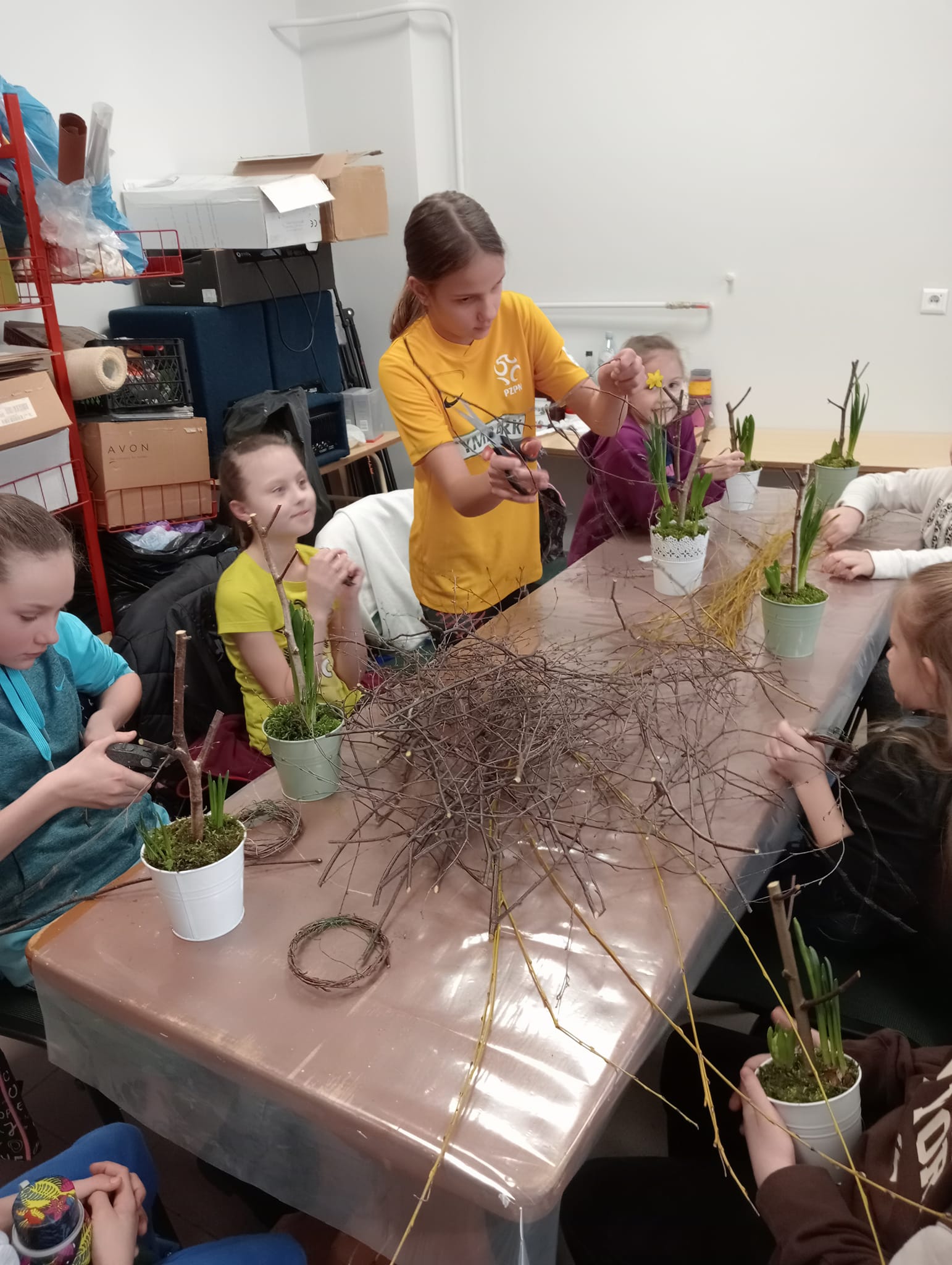 Dziewczynka układa puzzle przy stoliku w bibliotece Dzieci grają w ping-ponga na stole tenisowym Dwóch chłopców gra w piłkarzyki Dziewczynki rysują przy stoliczku w bibliotece Dwie dziewczynki układają puzzle na dywaniku w bibliotece Dzieci grają w ping-ponga przy stole tenisowym Dziecko umieszcza jajeczka w gniazdku, jako zwieńczenie kompozycji wiosennej Dzieci tną gałązki na gniazdka na warsztatach florystycznychWiosenna kompozycja, która powstała podczas warsztatów florystycznych