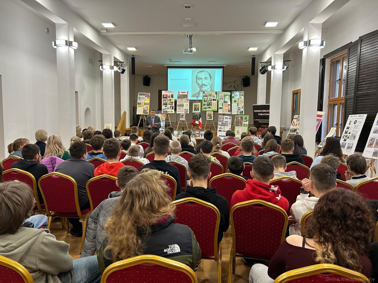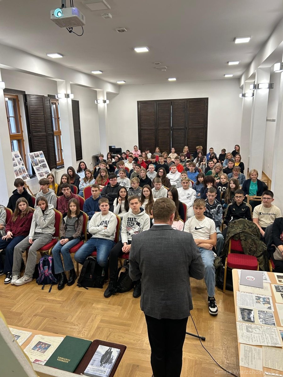 W naszej bibliotece w ostatni czwartek, 11. grudnia blisko 90 uczniów klas 7 naszych szkół z terenu naszej gminy wzięło udział w lekcji historii Romana Głowackiego o Wincentym Witosie i Stanisławie Mierzwie w Gminnej Bibliotece Publicznej.