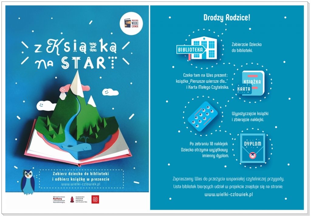 Przypominamy, że w tym roku kontynuujemy udział w projekcie „Mała książka – wielki człowiek”. Każde dziecko w wieku 3-6 lat dostanie od nas w prezencie specjalną Wyprawkę Czytelniczą na dobry start. Za każdą wizytę w bibliotece – zakończoną wypożyczeniem minimum jednej książki – otrzyma naklejkę, a po zebraniu kompletu zostanie uhonorowane imiennym Dyplomem Małego Czytelnika 🙂 Zapraszamy!!!