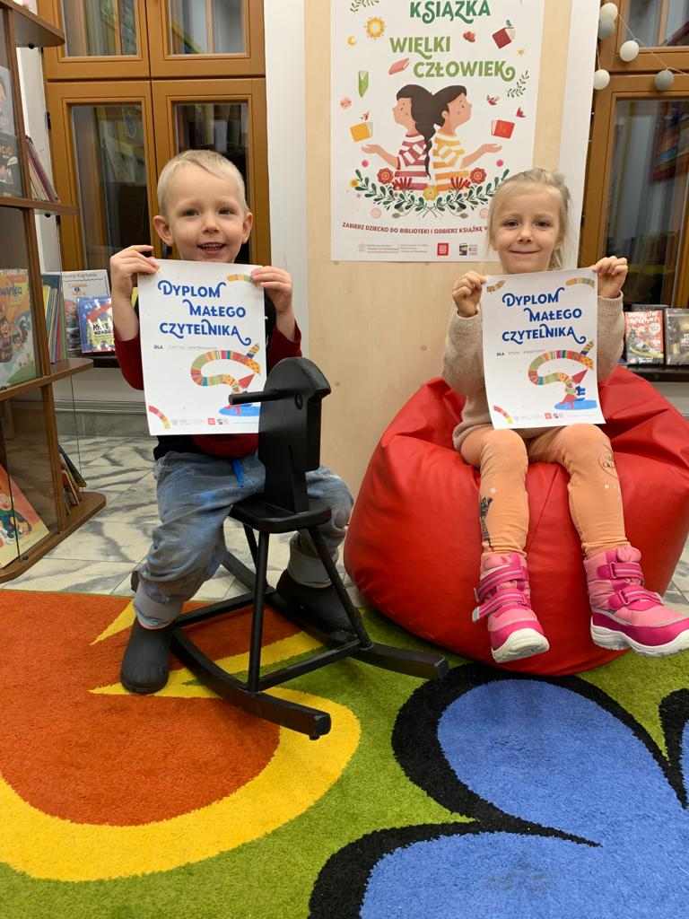 Chłopiec siedzi na krzesełku w dziale dziecięcym. W rękach trzyma Dyplom Małego Czytelnika.  Dziewczynka siedzi na pufie w dziale dziecięcym. w rękach trzyma Dyplom.