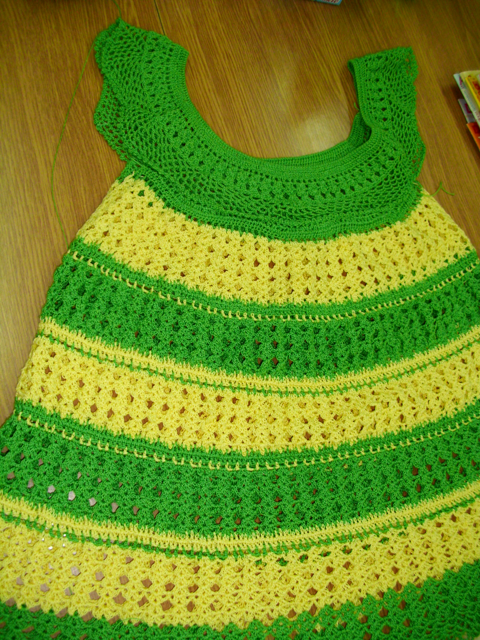 Bluzeczki: w zielono-żółte i bordowo-beżowe pasy (rozpoczęta); bez rękawów z łączonych elementów i sweterek z kwiatowymi wstawkami wykonała Bernadeta Bartnik.