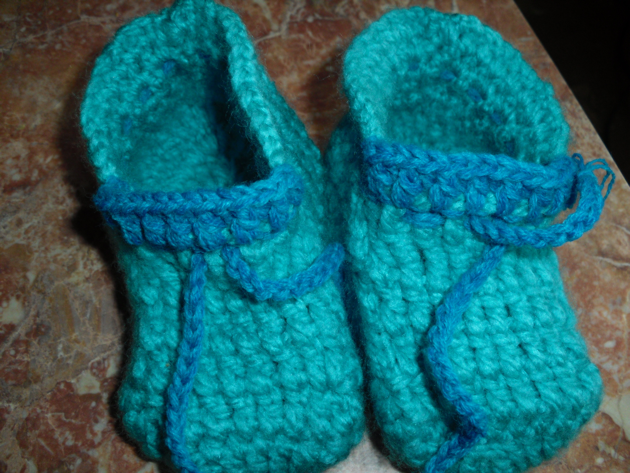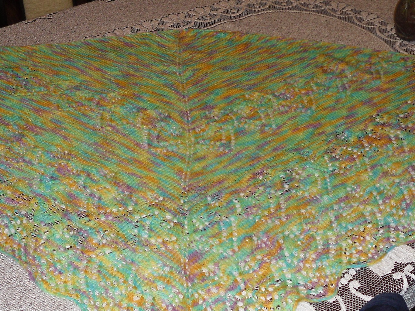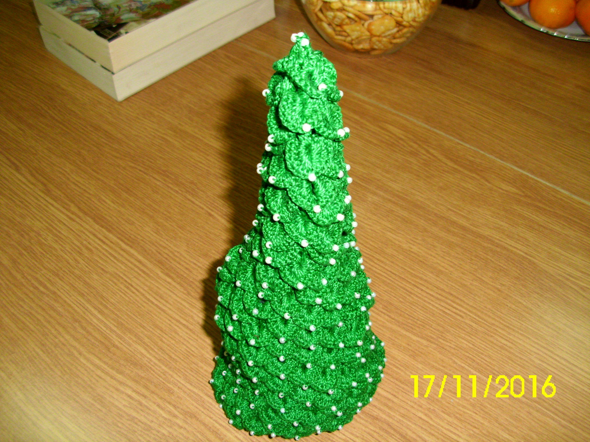 Katarzyna Kwaśniak: melanżowa chusta, 2 pary ciepłych dziecięcych kapci i ozdobiona koralikami choinka.
