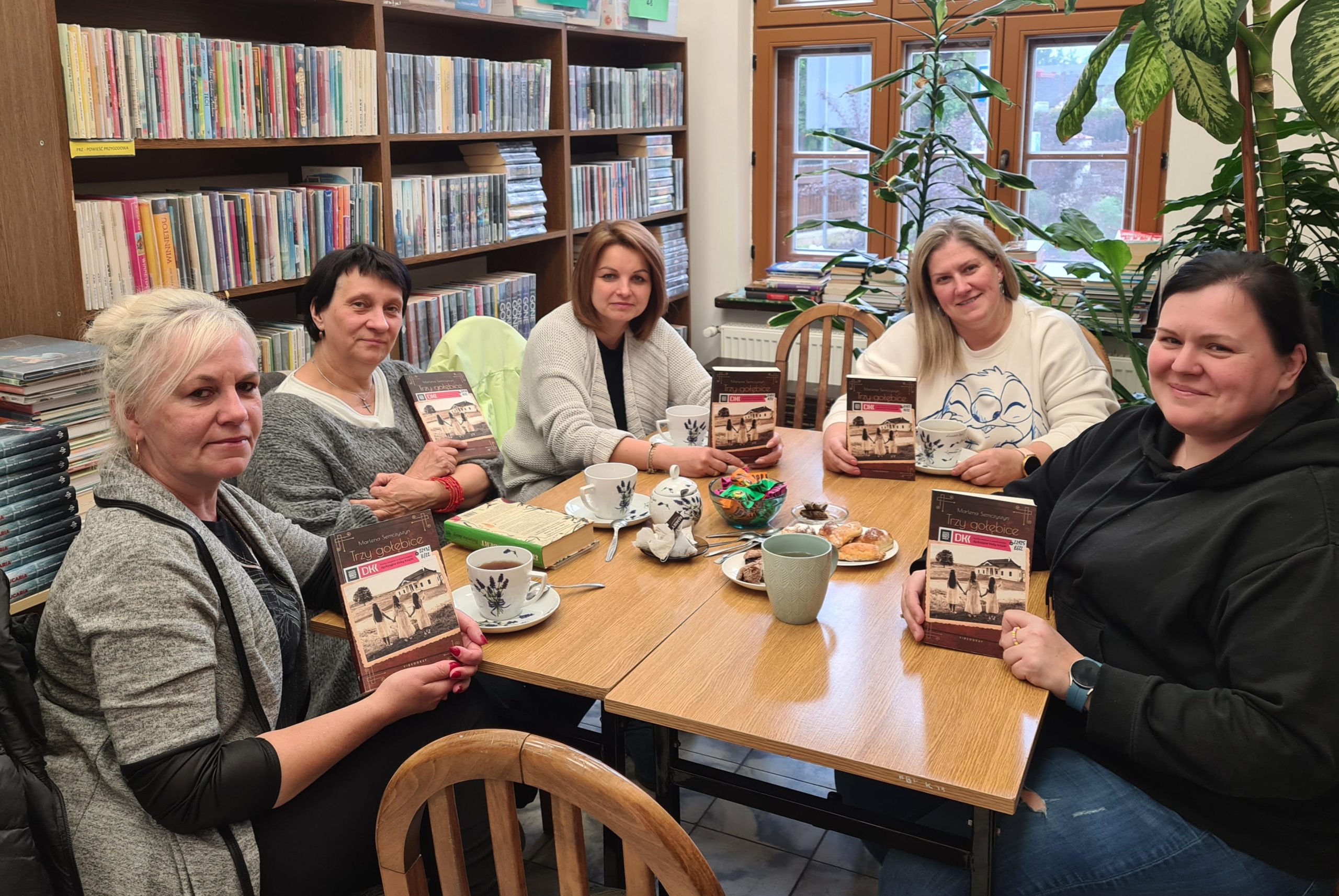 Grupa kobiet siedzi przy stoliku podczas spotkania Dyskusyjnego Klubu Książki. W dłoniach trzymają omawianą książkę "Trzy gołębice".