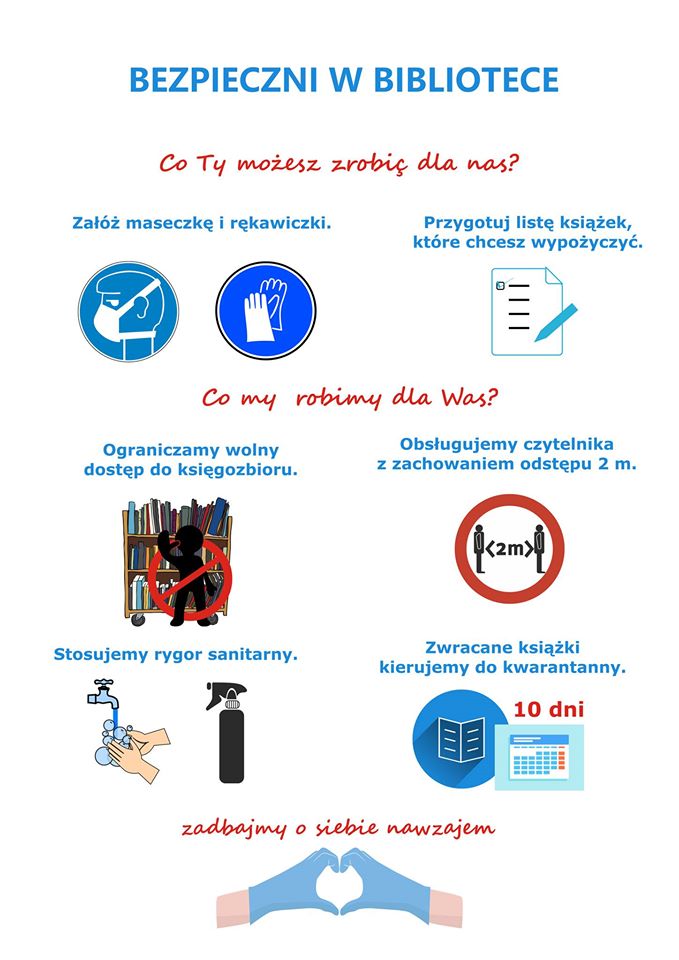 - Przed wejściem do biblioteki użytkownik ma obowiązek założenia rękawiczek oraz zasłonięcia nosa i ust (maseczka, szalik, chustka itp.), za wyjątkiem dzieci do lat 4 oraz osób zwolnionych z obowiązku noszenia maseczek ochronnych.