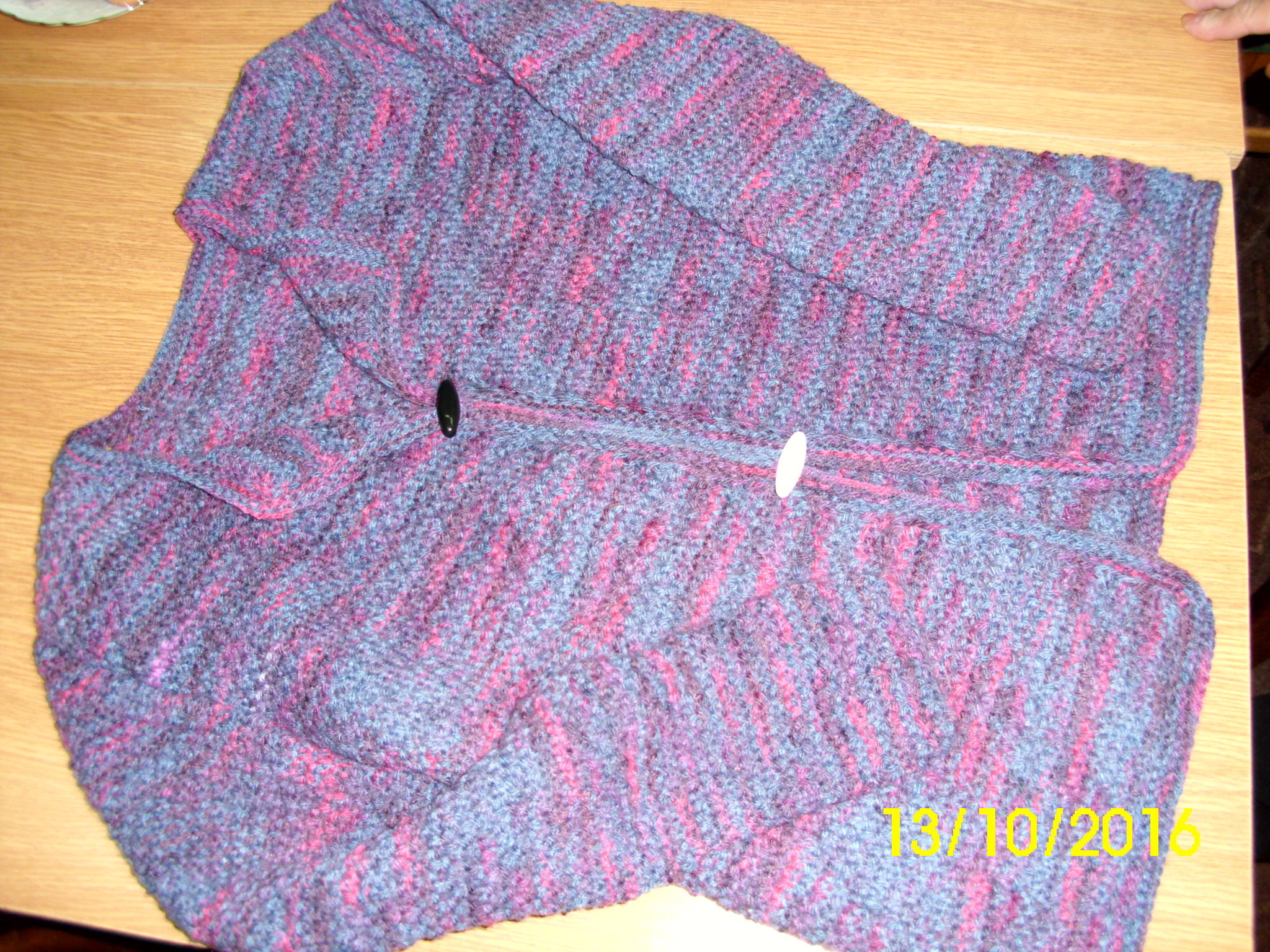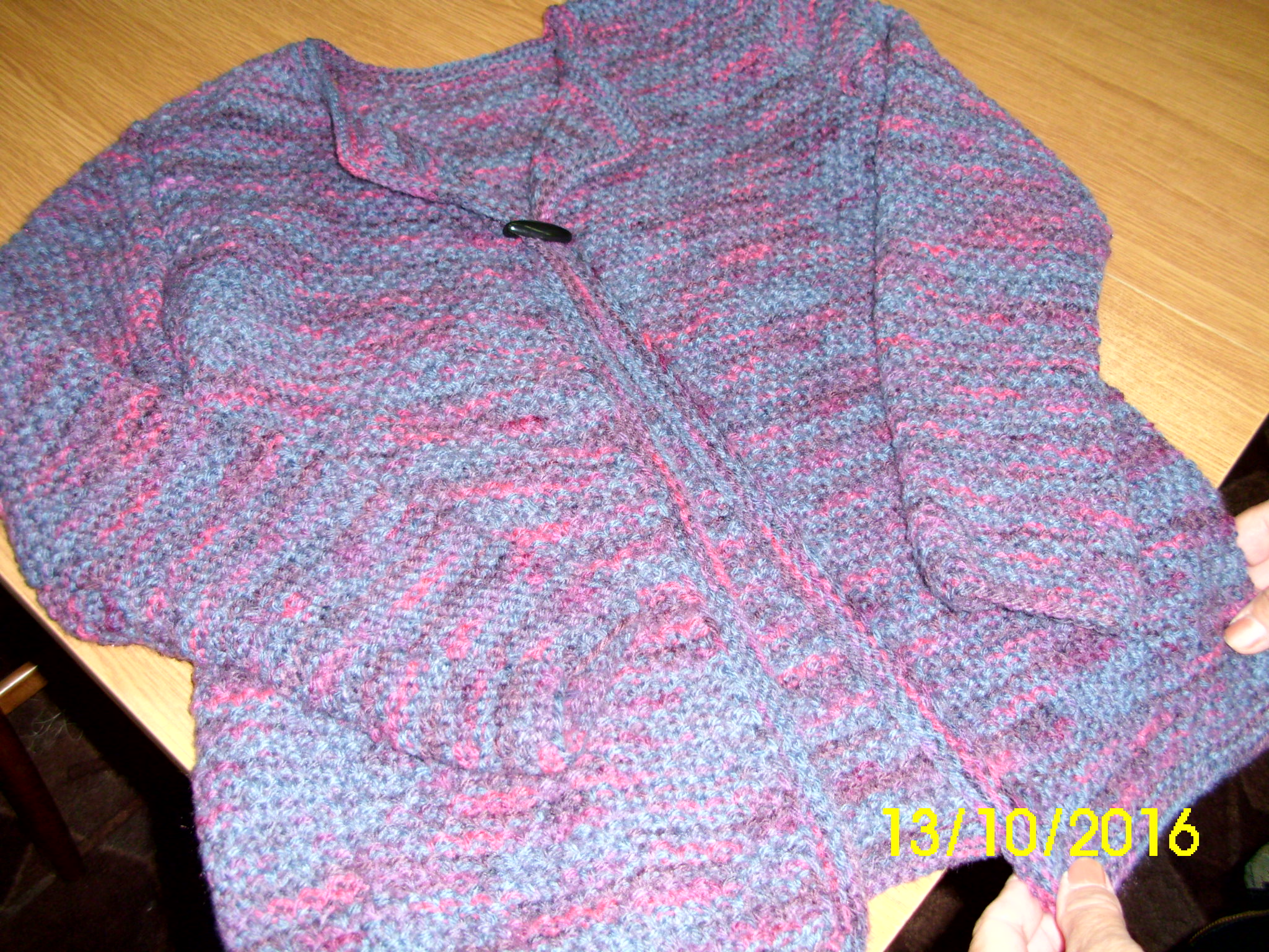 Ciepły sweter z melanżowanej włóczki wykonany na drutach i wykończony na szydełku przez Bernadetę Bartnik.