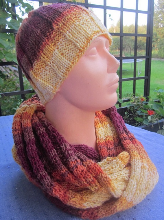 Długa kamizelka i komplet z cieniowanej włóczki składający się z czapki i szala, przygotowane przez Magdalenę Ziółkowską.
