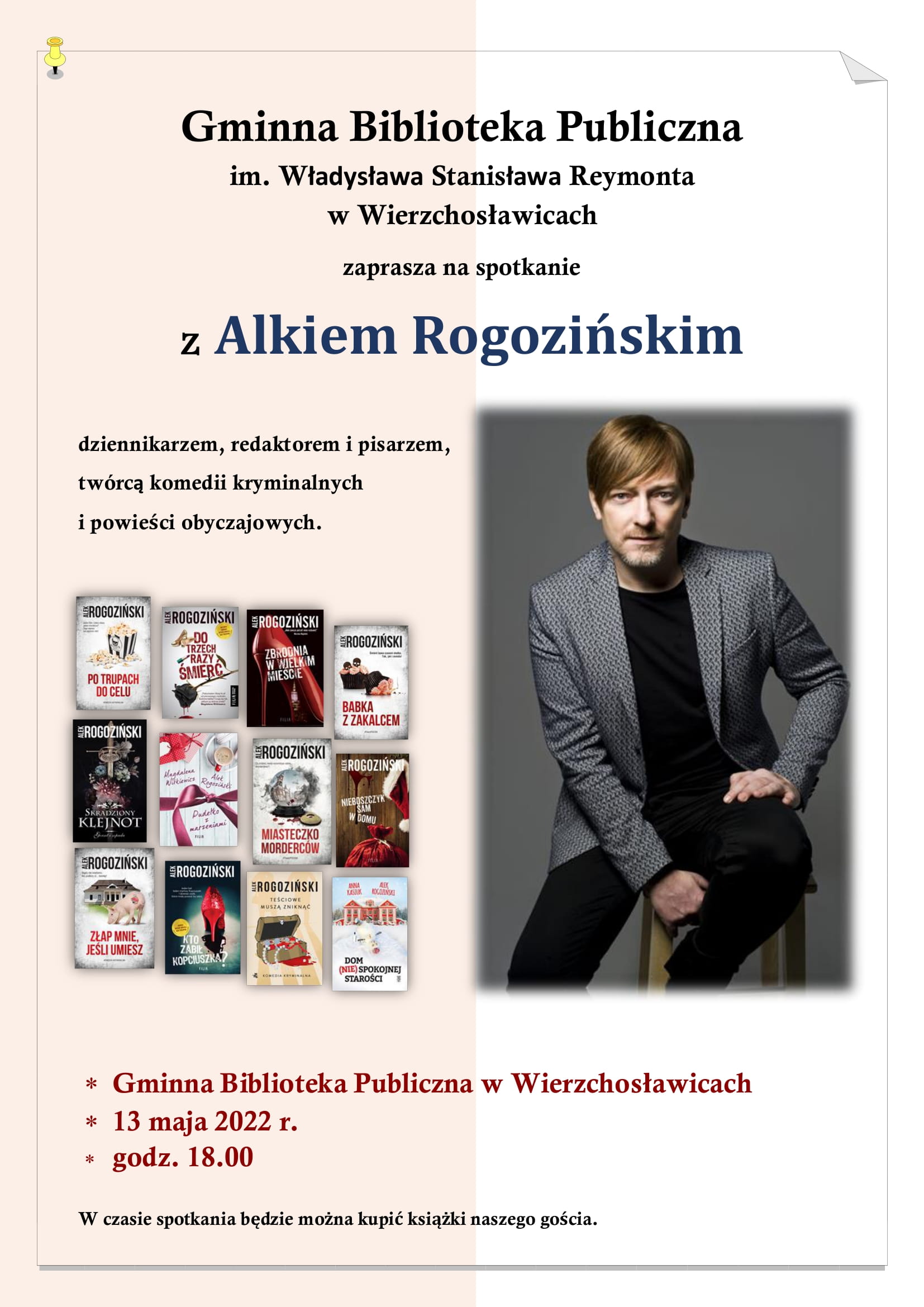 Gminna Biblioteka Publiczna im. Władysława Stanisława Reymonta w Wierzchosławicach zaprasza na spotkanie z Alkiem Rogozińskim, dziennikarzem, redaktorem i pisarzem, twórcą komedii kryminalnych i powieści obyczajowych.