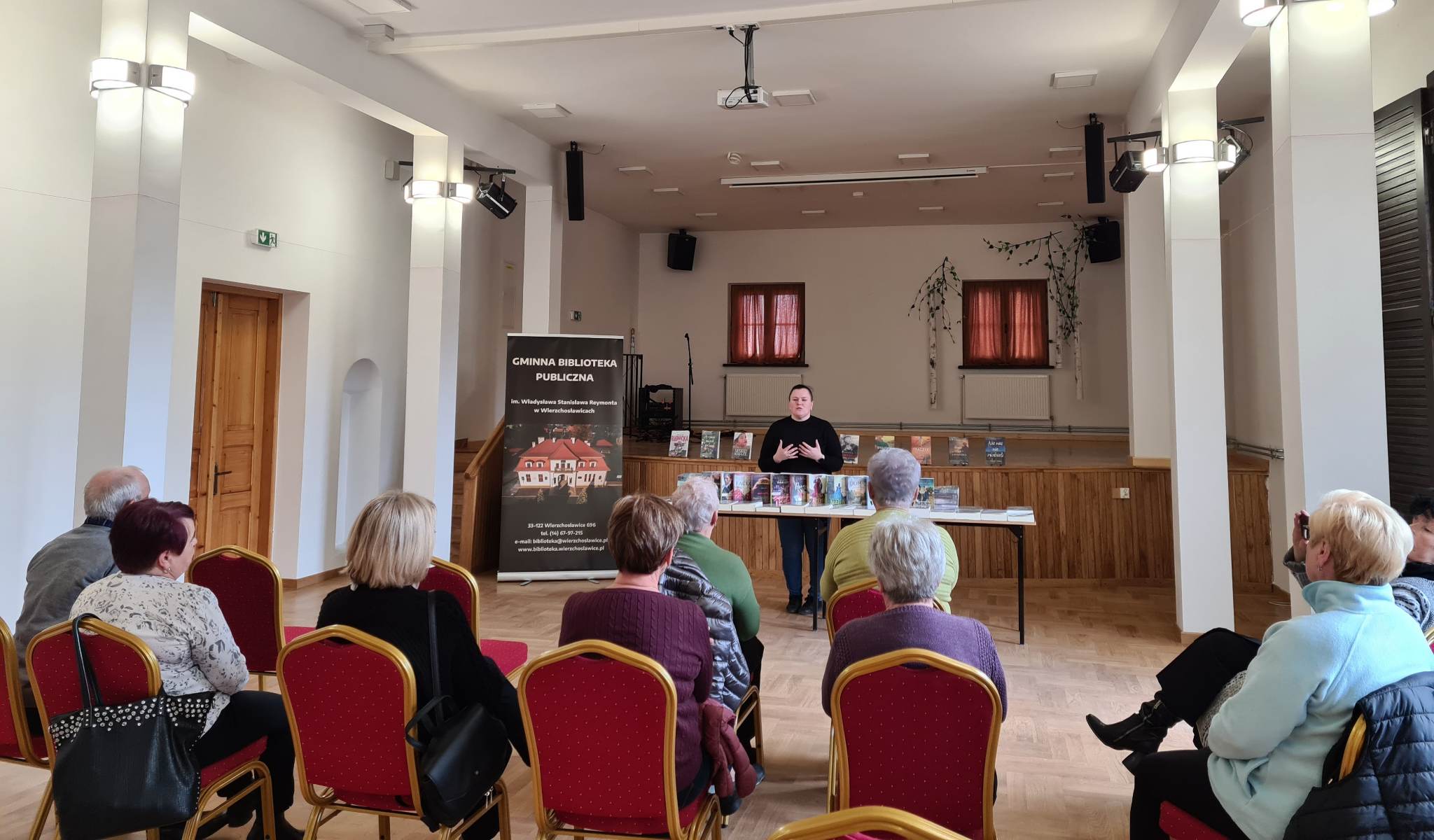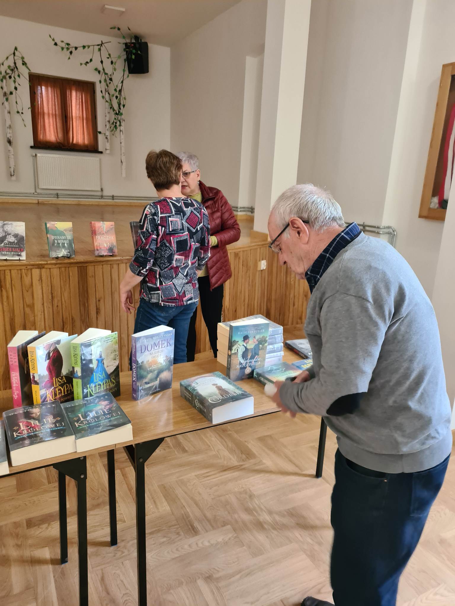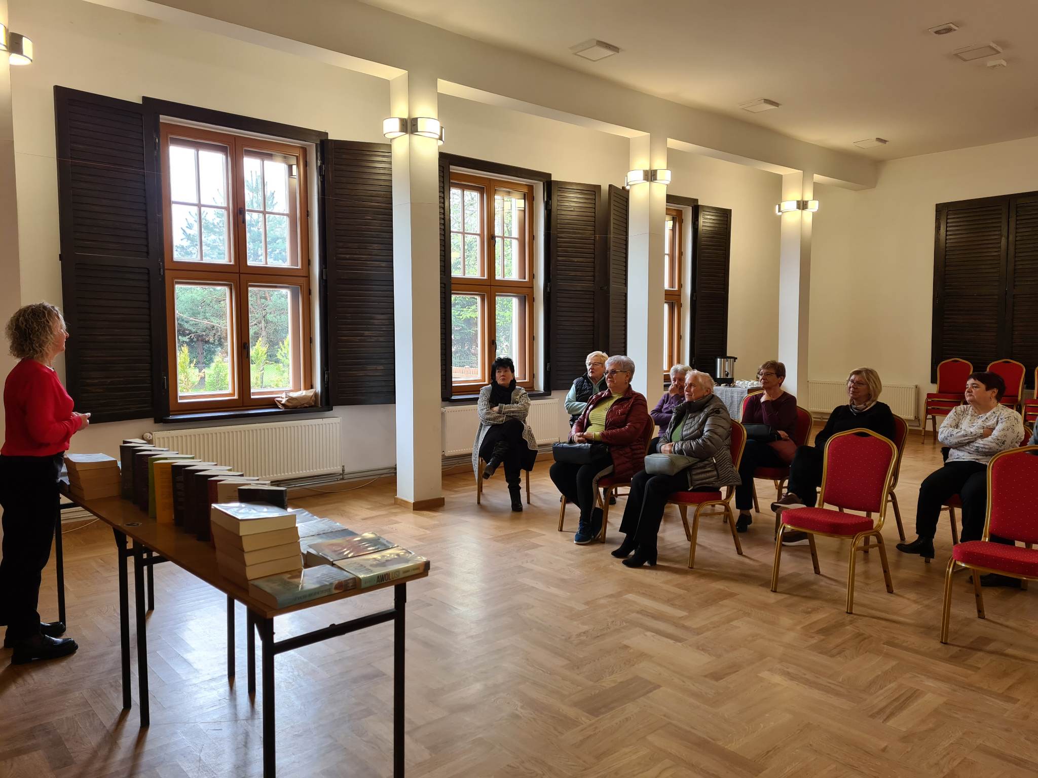 Książki z dużą czcionką są ułożone na stolikach Książki z dużą czcionką są ułożone na stolikach za stolikiem stoi bibliotekarka Seniorzy siedzą na krzesłach na dużej sali w bibliotece Książki z dużą czcionką są ułożone na stolikach za stolikiem stoi bibliotekarka Seniorzy siedzą na krzesłach na dużej sali w biblioteceKsiążki z dużą czcionką są ułożone na stolikach za stolikiem stoi bibliotekarka, przed nią na krzesłach siedzą seniorzy Pan ogląda książki spośród wystawionych na stoliku, dwie panie stoją za stolikiem i rozmawiają
