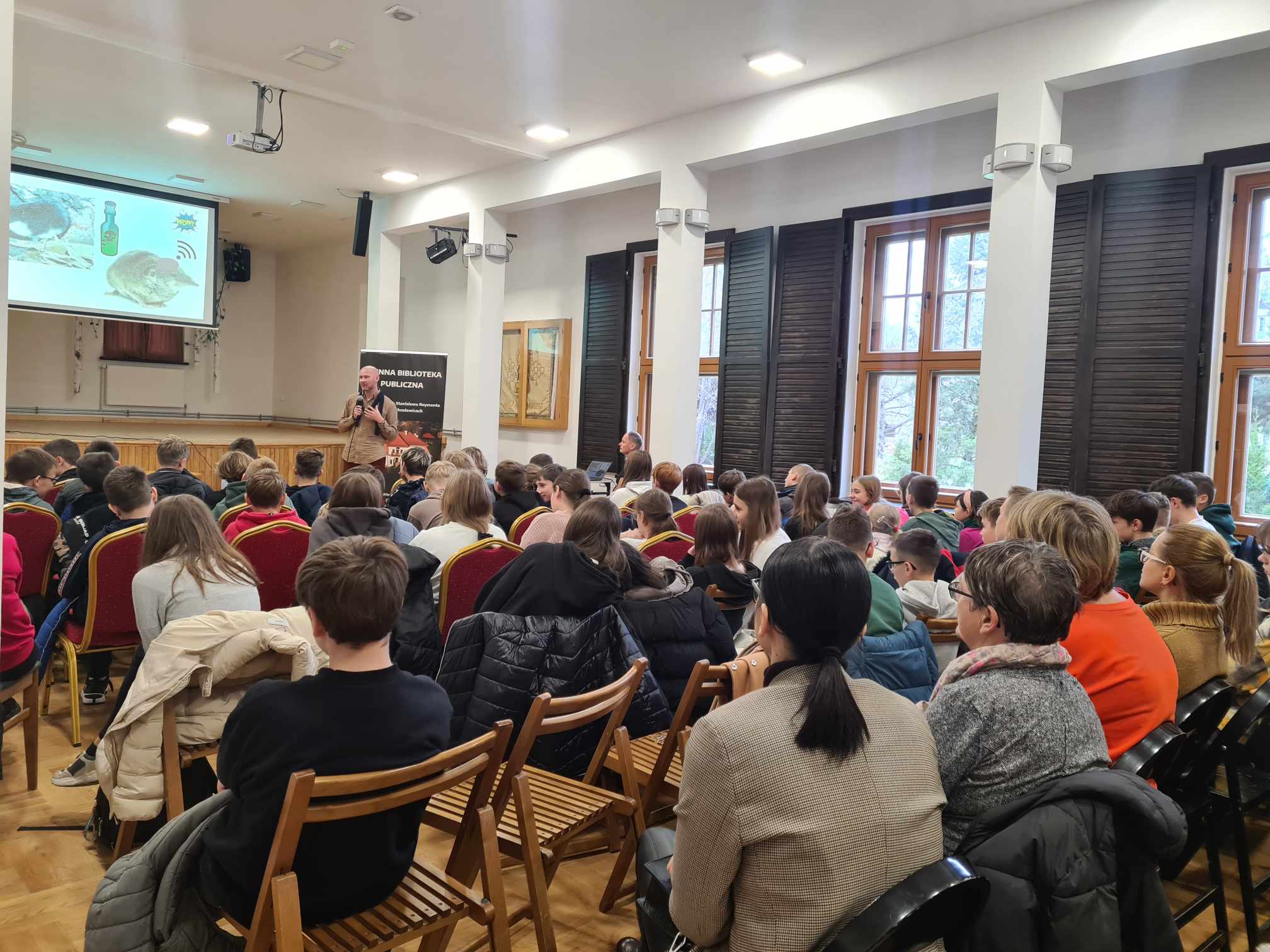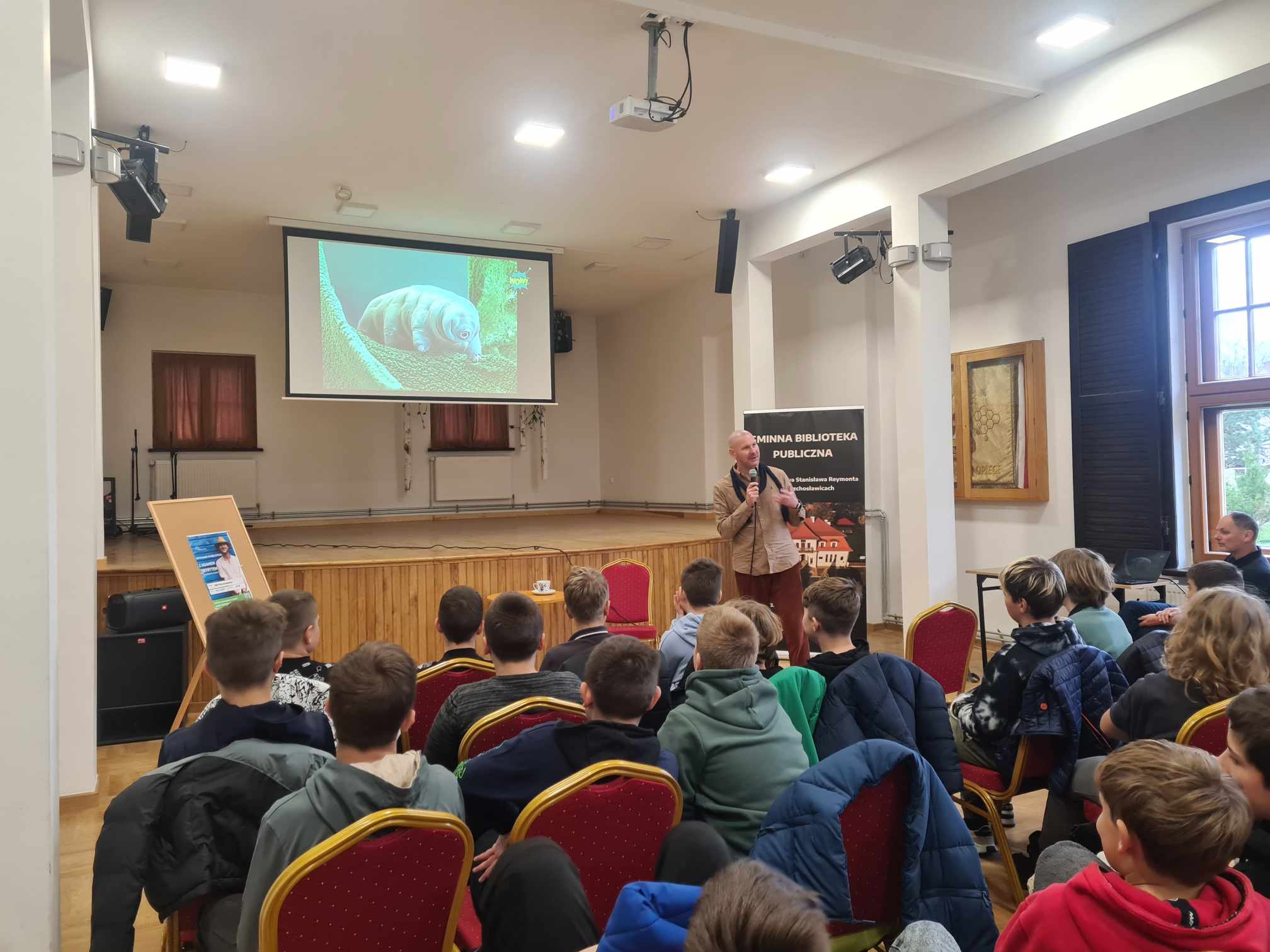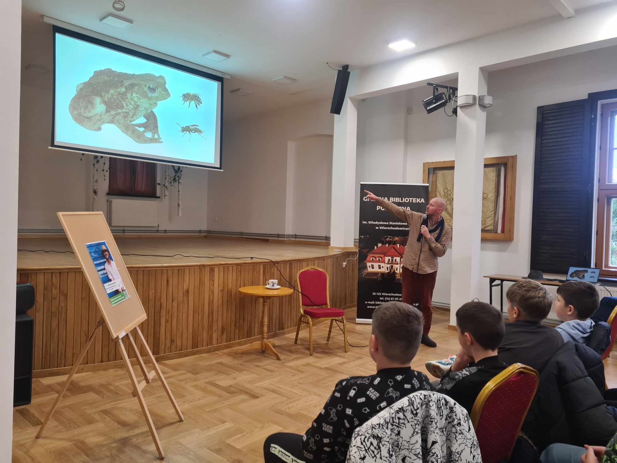Następnie nasz gość opowiedział młodzieży ze Szkoły Podstawowej im. 100-lecia Ruchu Ludowego w Wierzchosławicach oraz Szkoły Podstawowej im. Tadeusza Kościuszki w Łętowicach o Super Mocach, jakie mają zwierzęta, które żyją tuż obok nas. Badacz, który na co dzień obserwuje przyrodę głównie w Puszczy Białowieskiej, przekazał młodzieży wiele ciekawostek, które zaowocowały aktywną serią pytań do prowadzącego. Opowiadanie o tym, ile może ważyć bocianie gniazdo, czym jest wyrównanie magnetyczne i jakie zwierzęta pan Adam najbardziej lubi „podglądać”, mocno zaciekawiły uczniów.