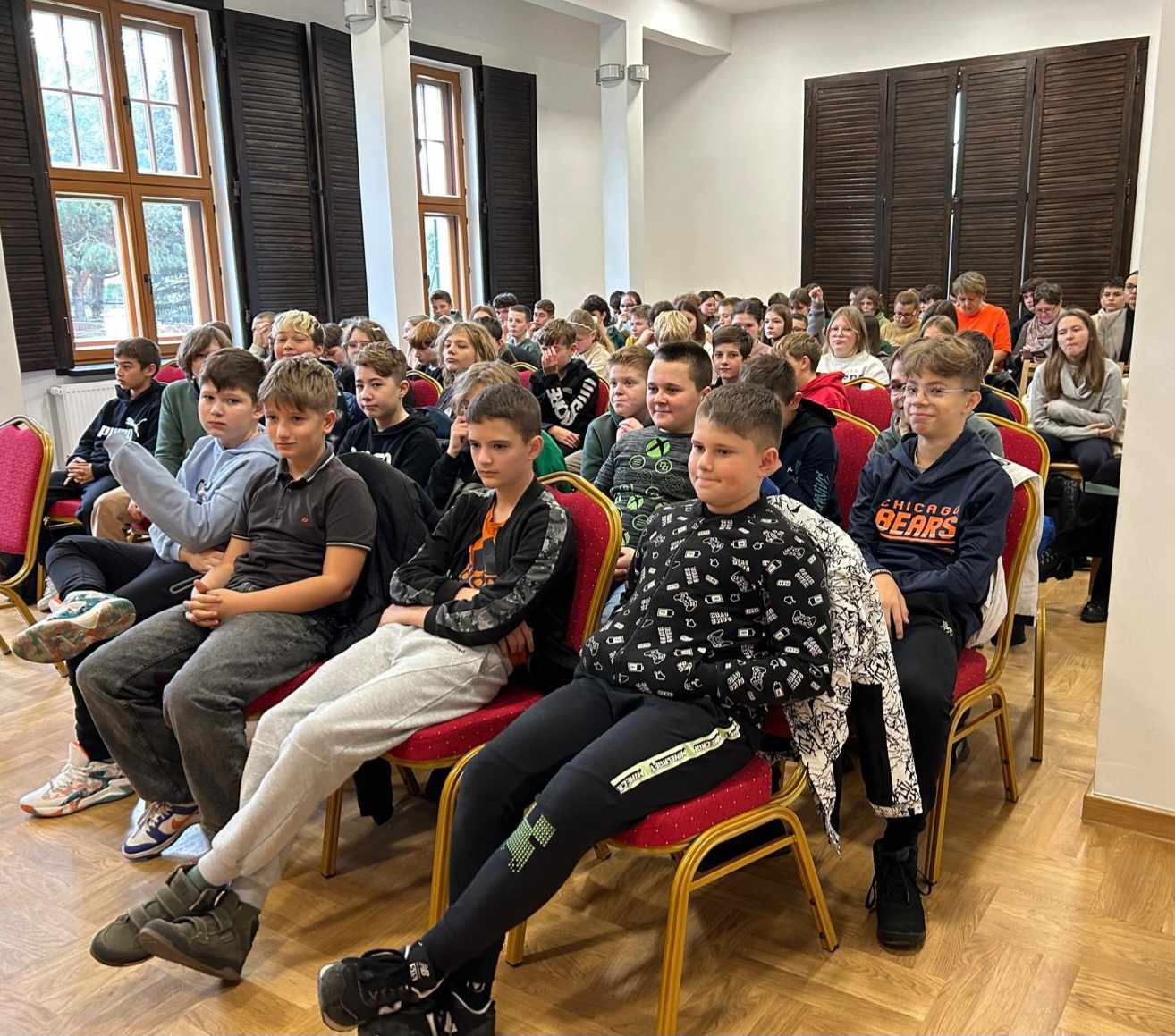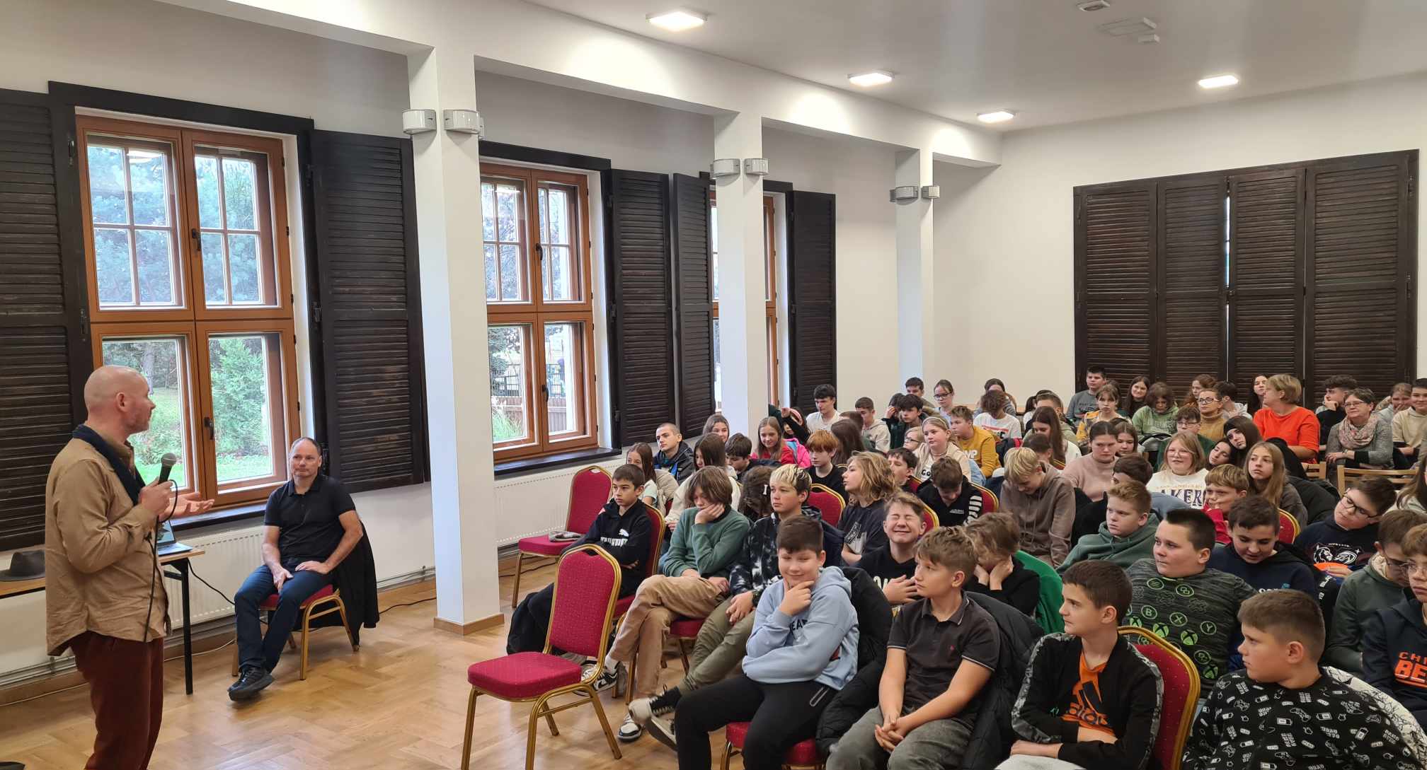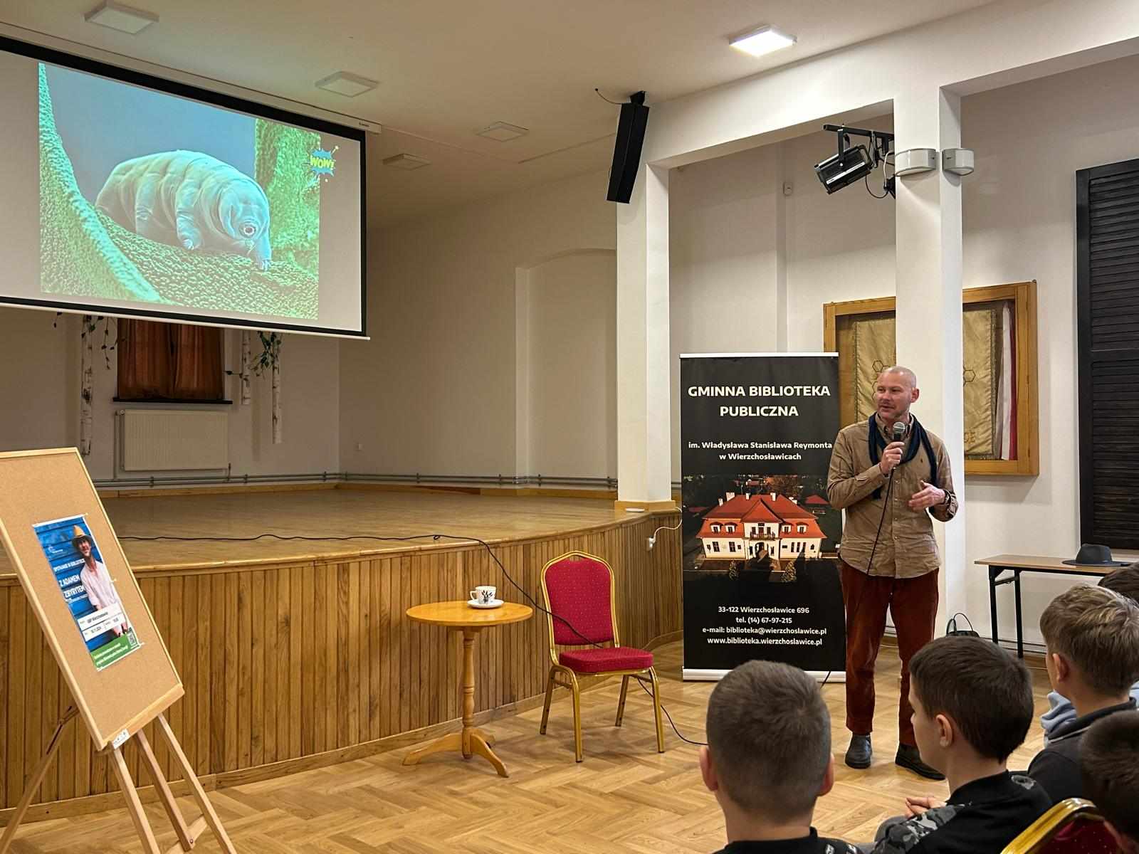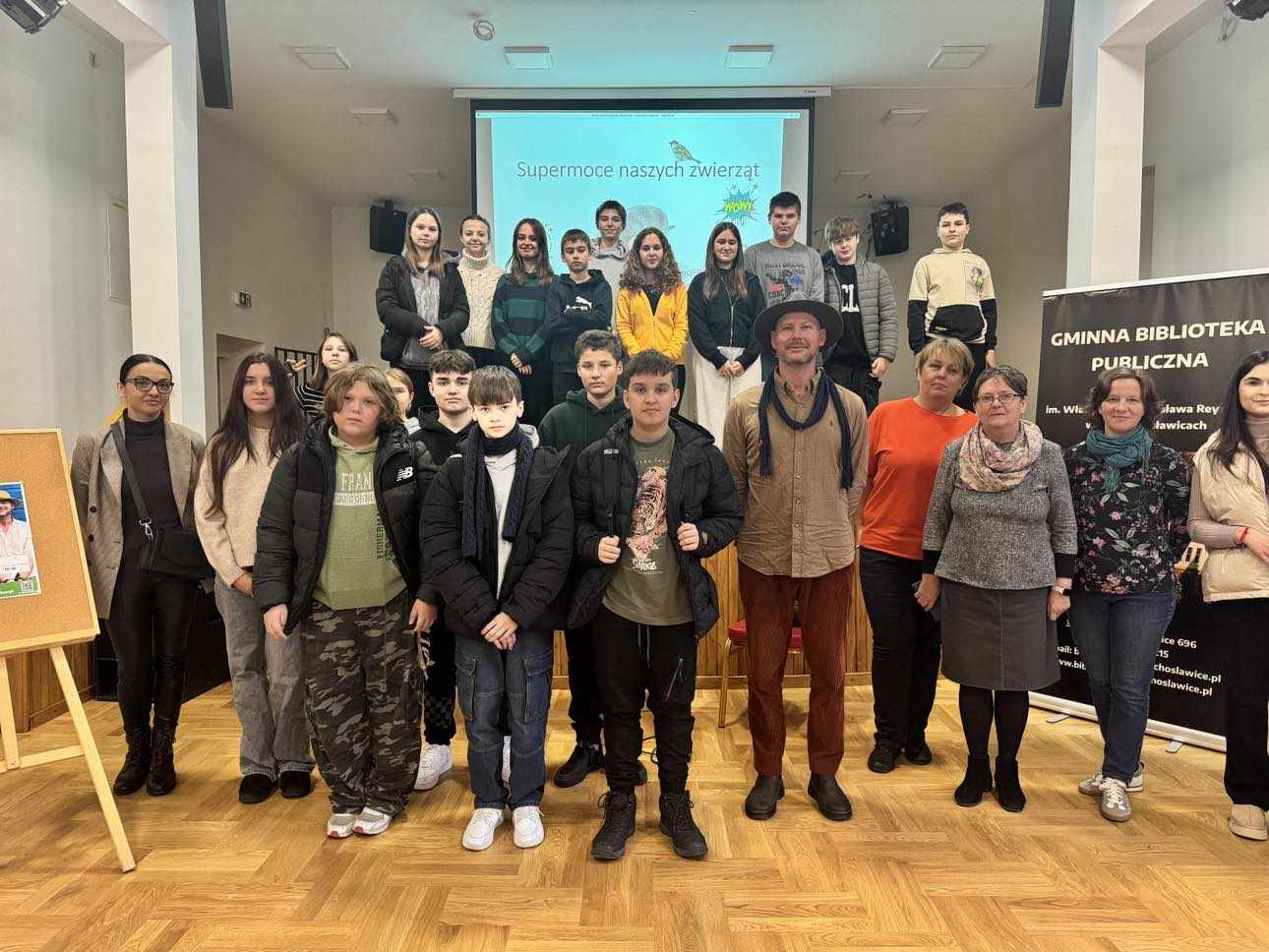 Następnie nasz gość opowiedział młodzieży ze Szkoły Podstawowej im. 100-lecia Ruchu Ludowego w Wierzchosławicach oraz Szkoły Podstawowej im. Tadeusza Kościuszki w Łętowicach o Super Mocach, jakie mają zwierzęta, które żyją tuż obok nas. Badacz, który na co dzień obserwuje przyrodę głównie w Puszczy Białowieskiej, przekazał młodzieży wiele ciekawostek, które zaowocowały aktywną serią pytań do prowadzącego. Opowiadanie o tym, ile może ważyć bocianie gniazdo, czym jest wyrównanie magnetyczne i jakie zwierzęta pan Adam najbardziej lubi „podglądać”, mocno zaciekawiły uczniów.