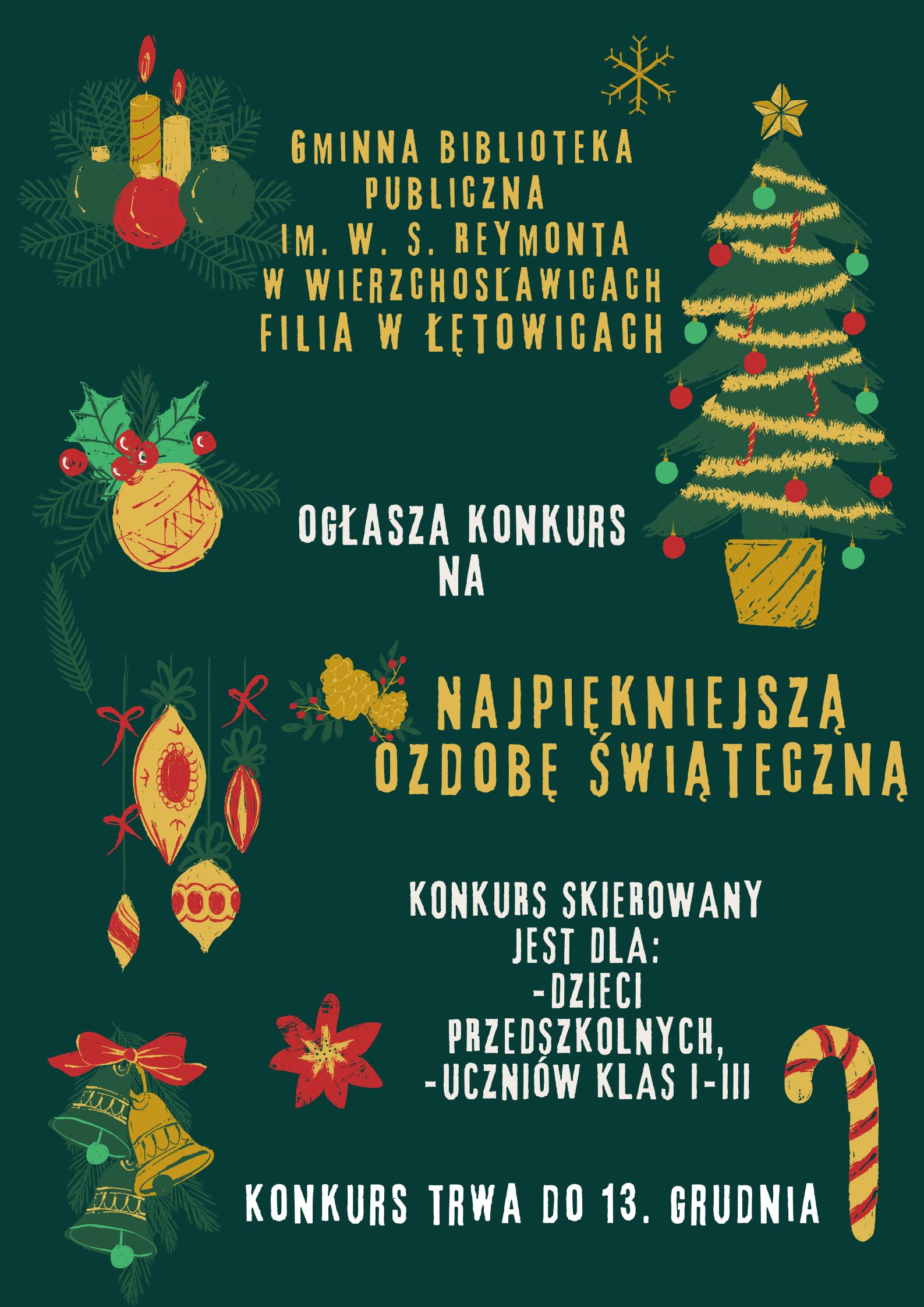 Gminna Biblioteka Publiczna Filia w Łętowicach zaprasza dzieci przedszkolne oraz uczniów z klas I-III szkoły podstawowej do udziału w konkursie plastycznym na najpiękniejszą ozdobę choinkową. Szczegóły konkursu oraz zgody zawarte są w regulaminie zamieszczonym na stronie internetowej organizatora konkursu.