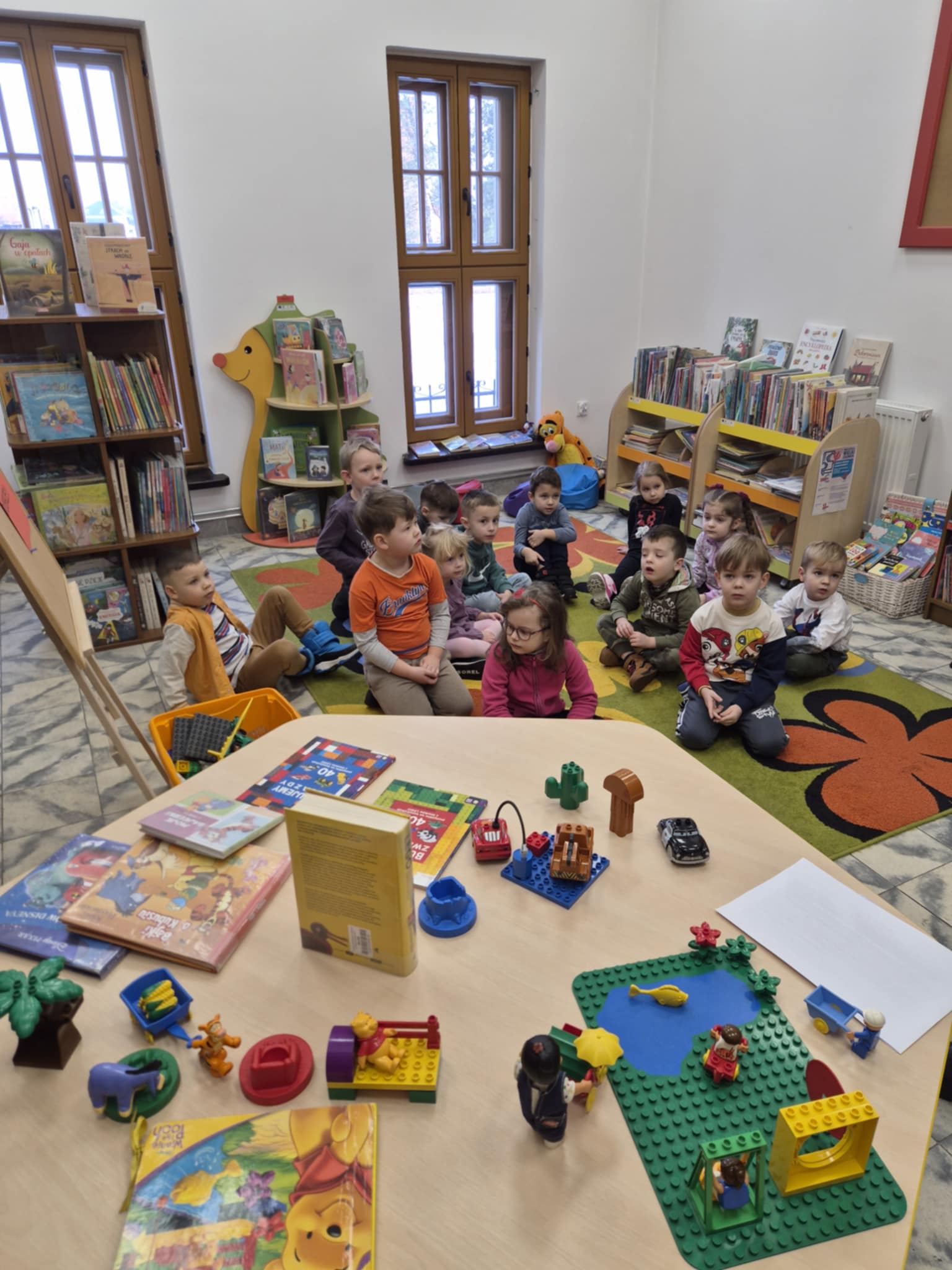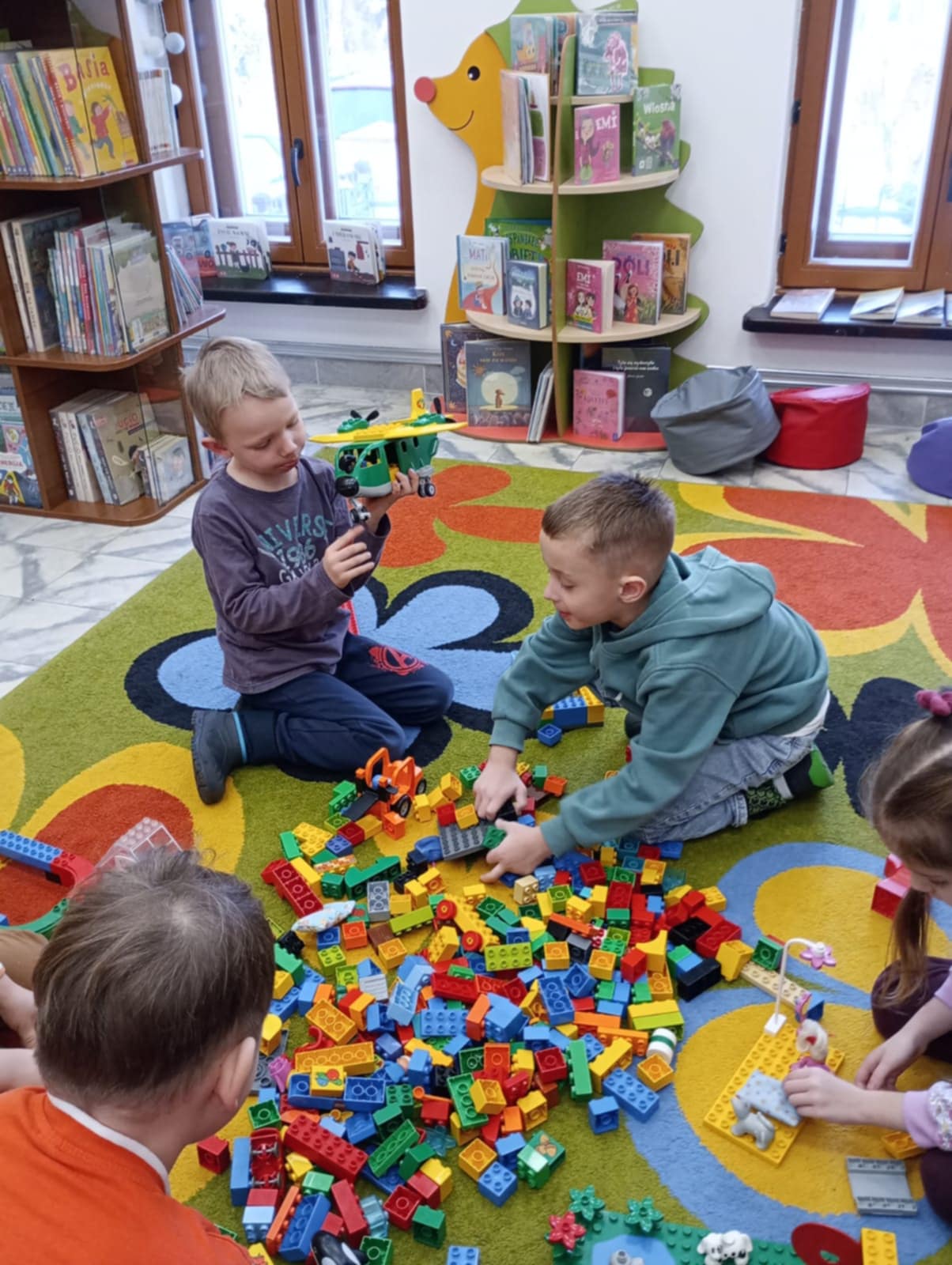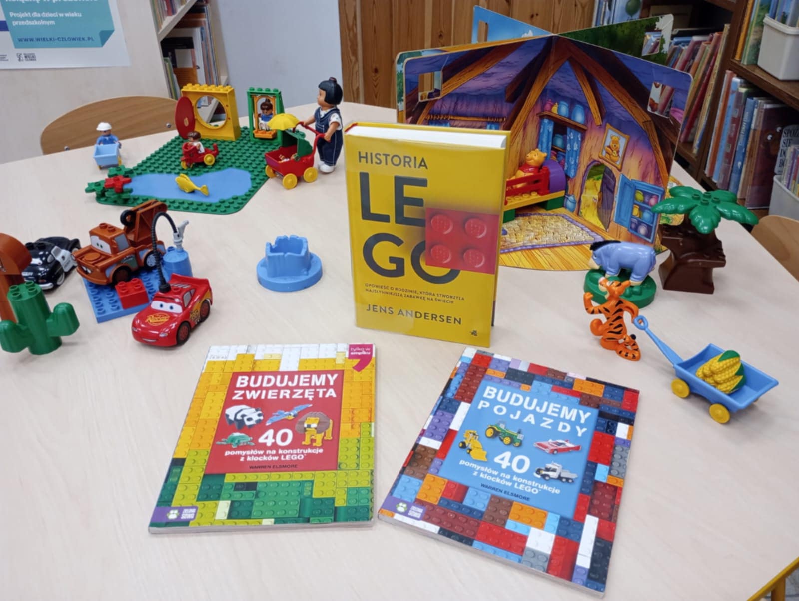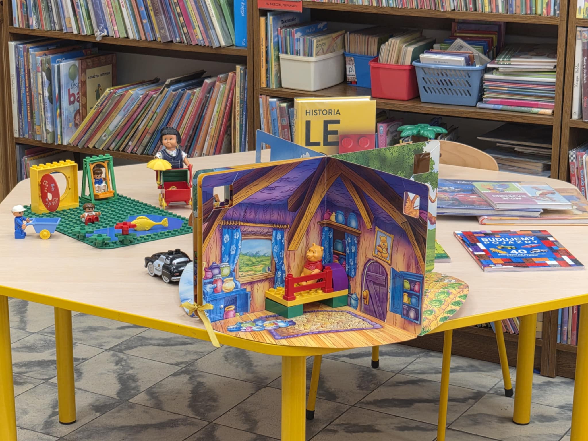A ponieważ nie ma ograniczeń co do zabawy klockami Lego, dzisiaj w bibliotece swoją wyobraźnię uruchomiły dzieci i dorośli 🙂 Doskonałym początkiem pobudzającym kreatywność był popbook związany z historią Kubusia Puchatka. Nie ma nic piękniejszego niż historie wymyślone i opowiedziane przez dzieci. Dzisiaj właśnie książka oraz klocki dały taką możliwość przedszkolakom z „Niepublicznego Przedszkola Słoneczko” w Wierzchosławicach. Zobaczcie sami, jak piękne historie zilustrowali klockami Lego nasi goście.