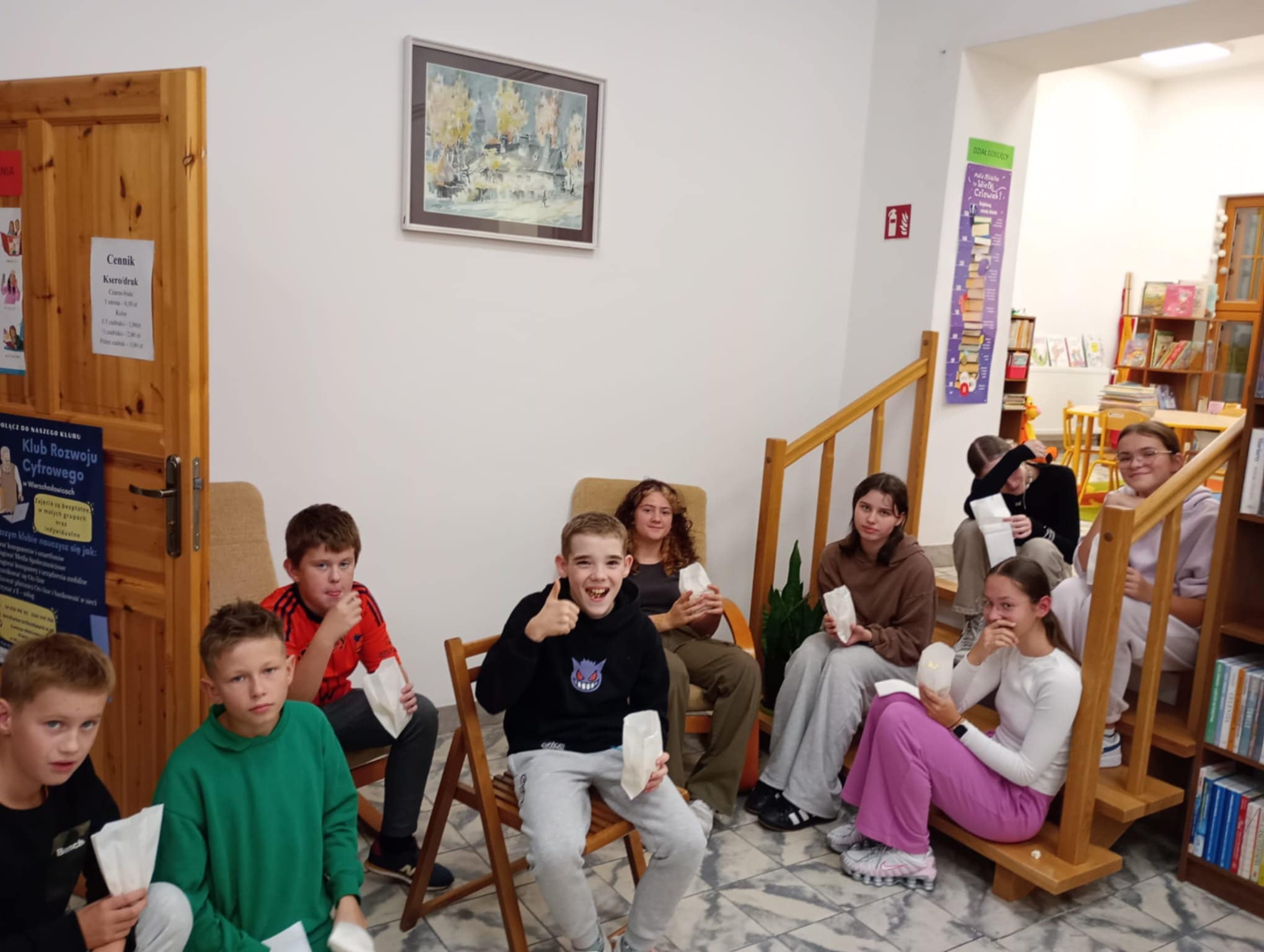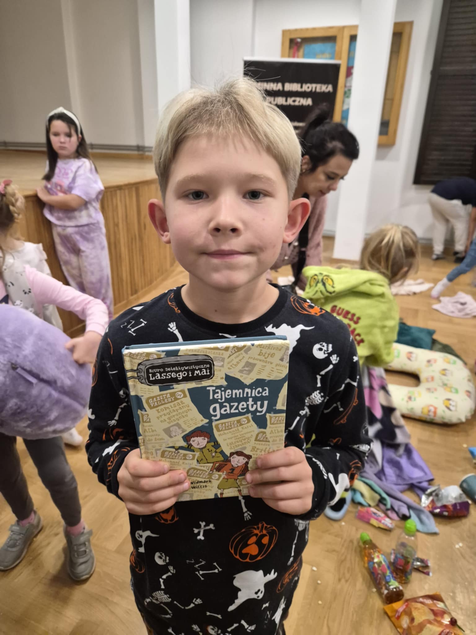 Ostatni piątek był najdłuższą „Nocą w bibliotece” do tej pory! A wszystko dlatego, że nasza akcja, choć nocna, rozpoczęła się już w godzinach przedpołudniowych, kiedy to odwiedziła nas młodzież ze Specjalnego Ośrodka Szkolno-Wychowawczego w Wierzchosławicach-Dwudniakach. Początek weekendu upłynął nam pod znakiem kina i gier planszowych. 🙂 Młodzież z Ośrodka, a potem wieczorem dzieci, w piżamach, obejrzały film przygotowany specjalnie na Noc Bibliotek – „Biuro detektywistyczne Lassego i Mai. Rabuś z pociągu”, który powstał na podstawie książki autorstwa Martina Widmarka, autora popularnej serii książek dla dzieci.