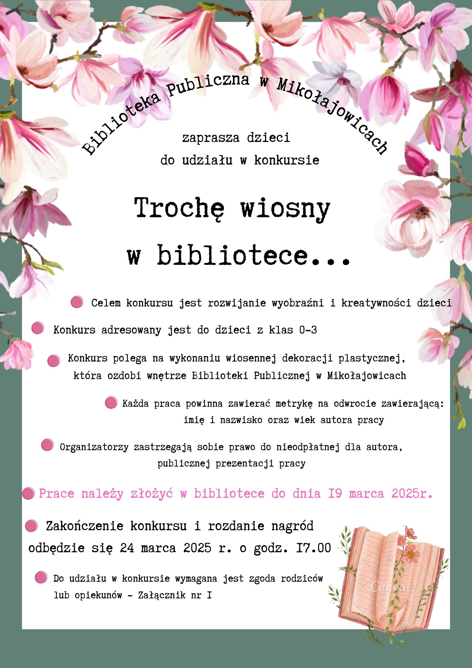 Biblioteka Publiczna w Mikołajowicach zaprasza dzieci do udziału w konkursie „Trochę wiosny w bibliotece…”.