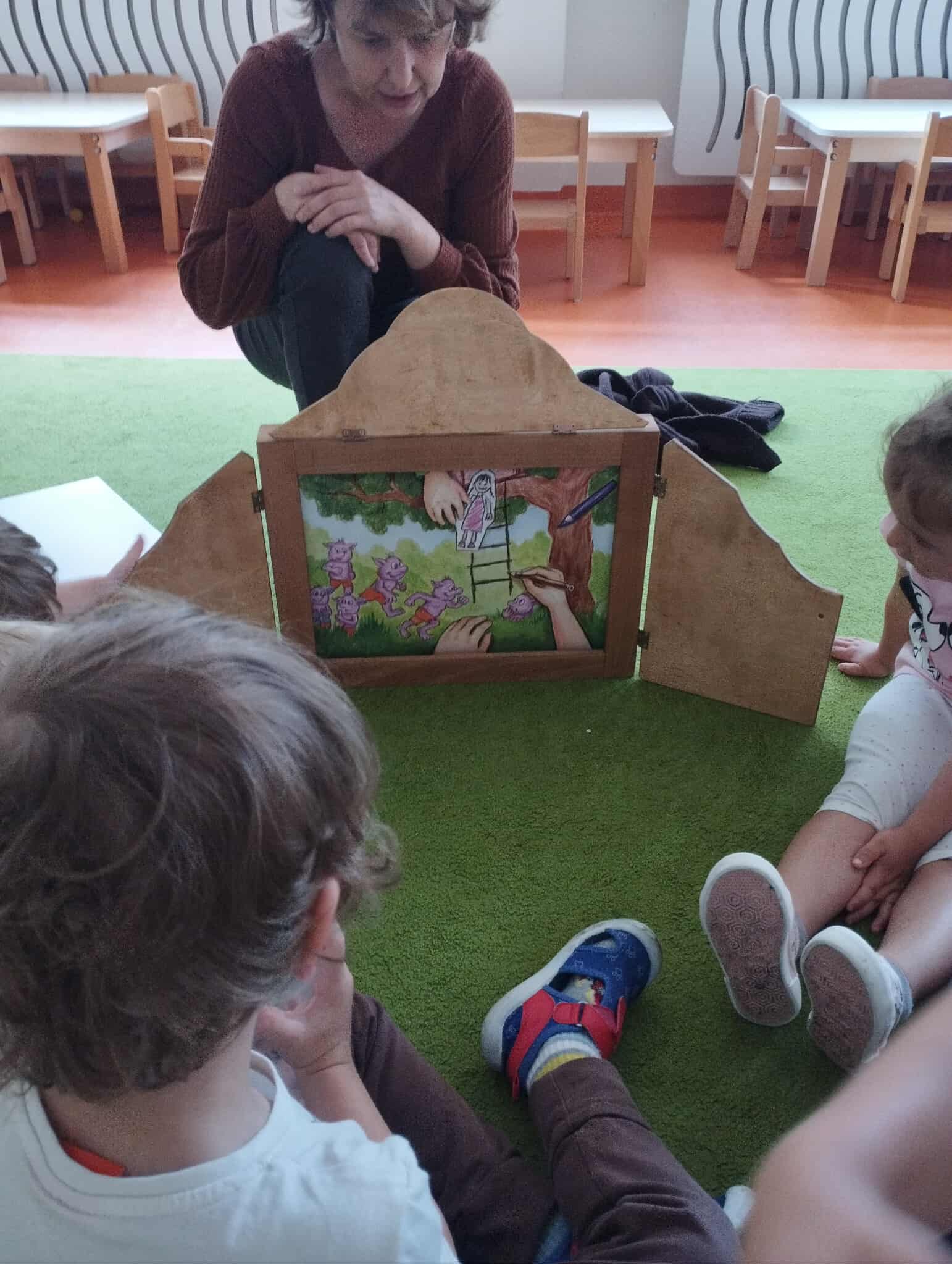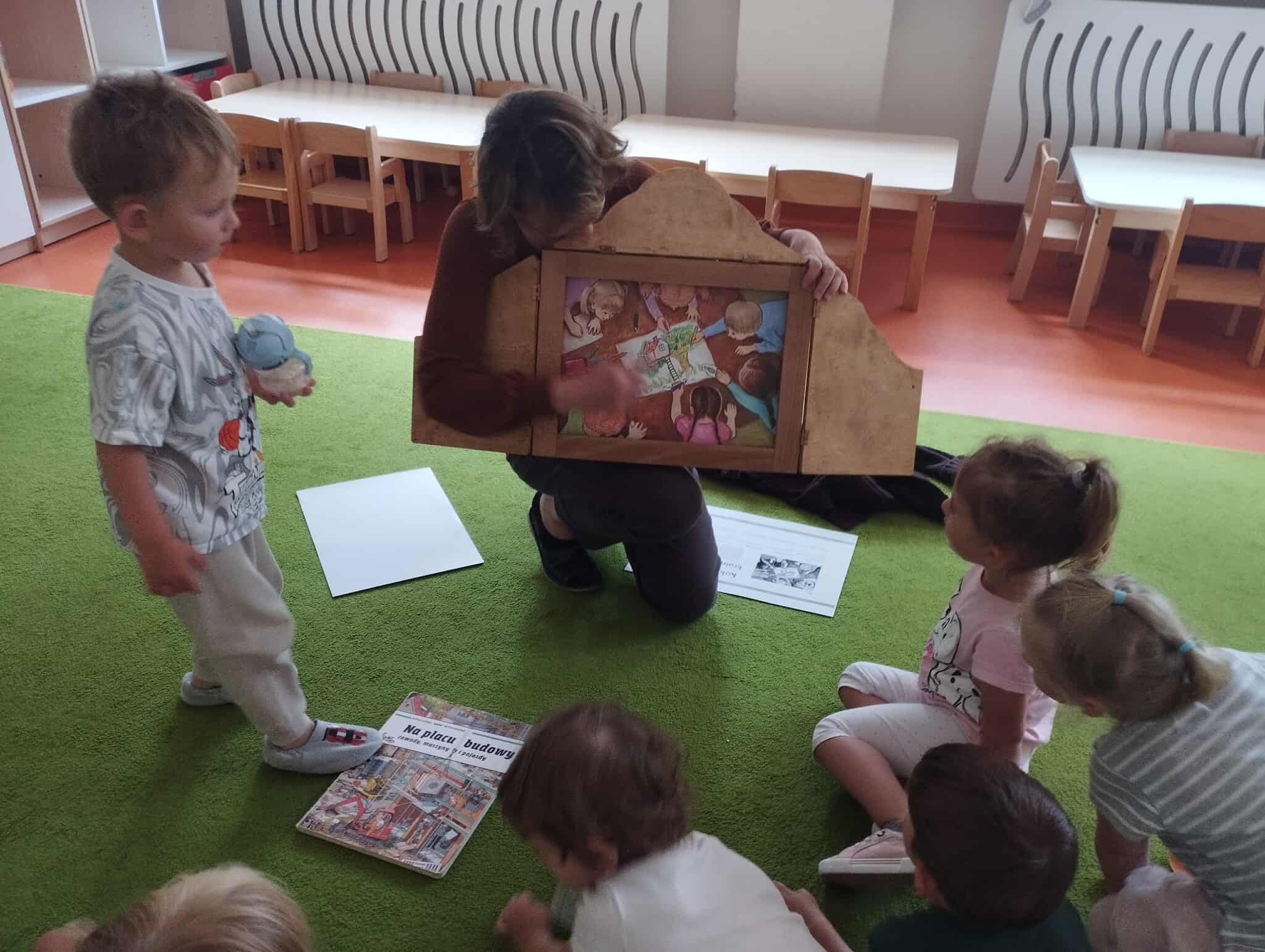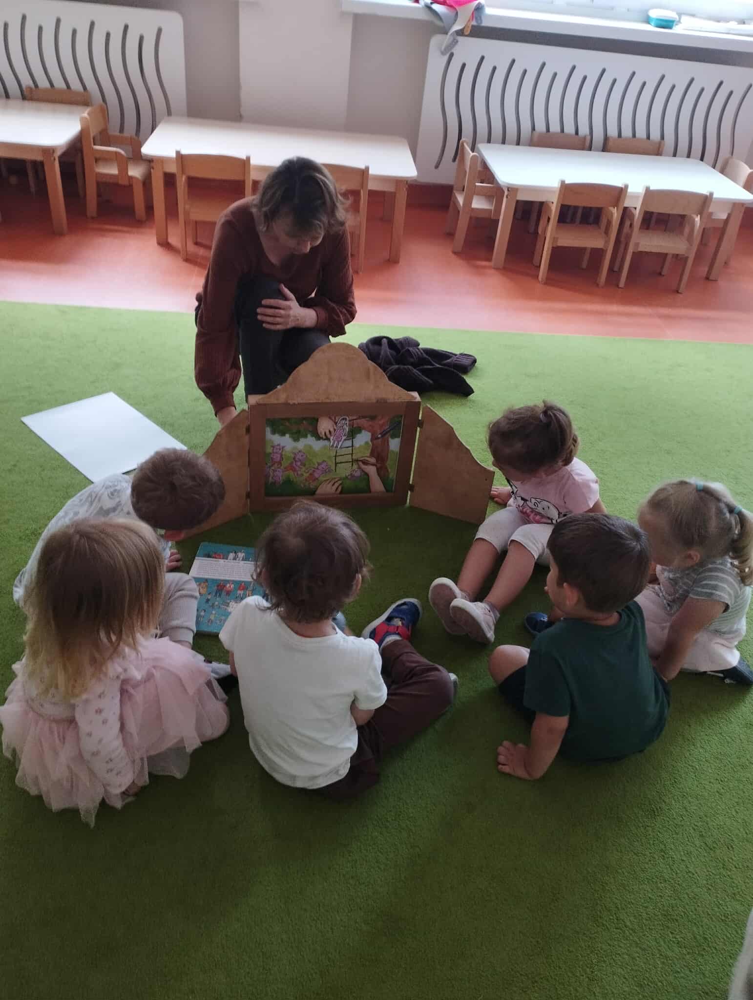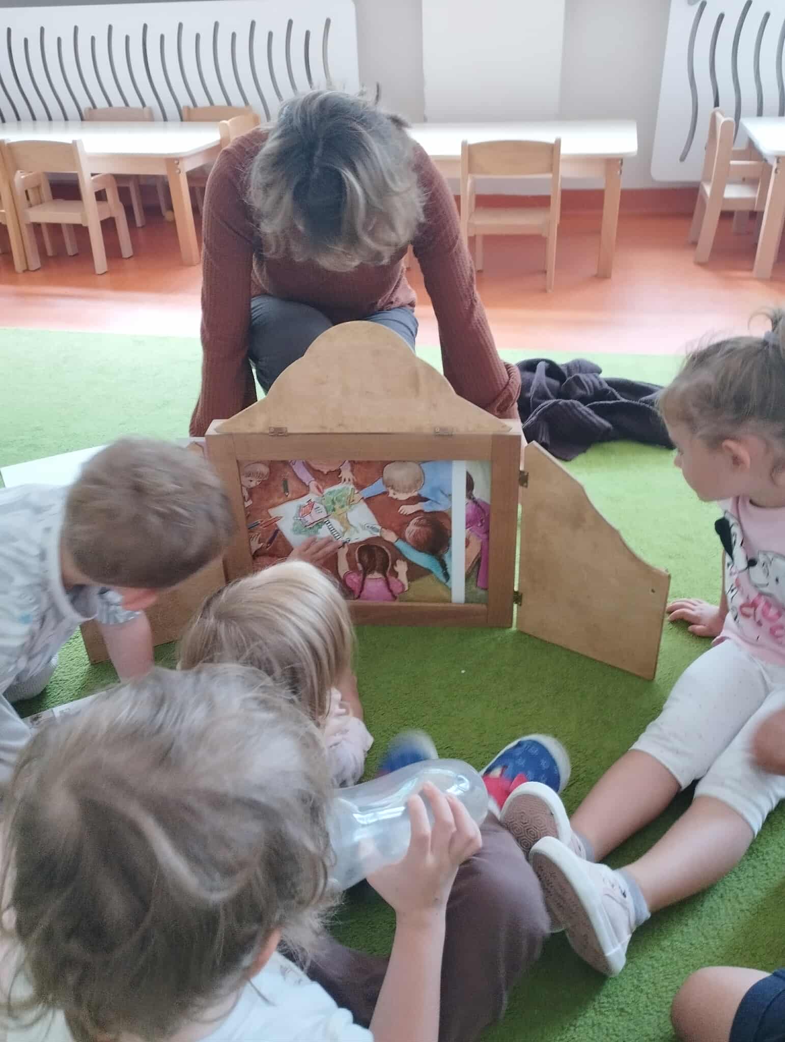 Wtorkowa odsłona Czytania na dywanie w żłobku w Bogumiłowicach i teatrzyku kamishibai. Tym razem dzieci poznały bohaterów książki „Kolorowe kredki i kraina wyobraźni”.