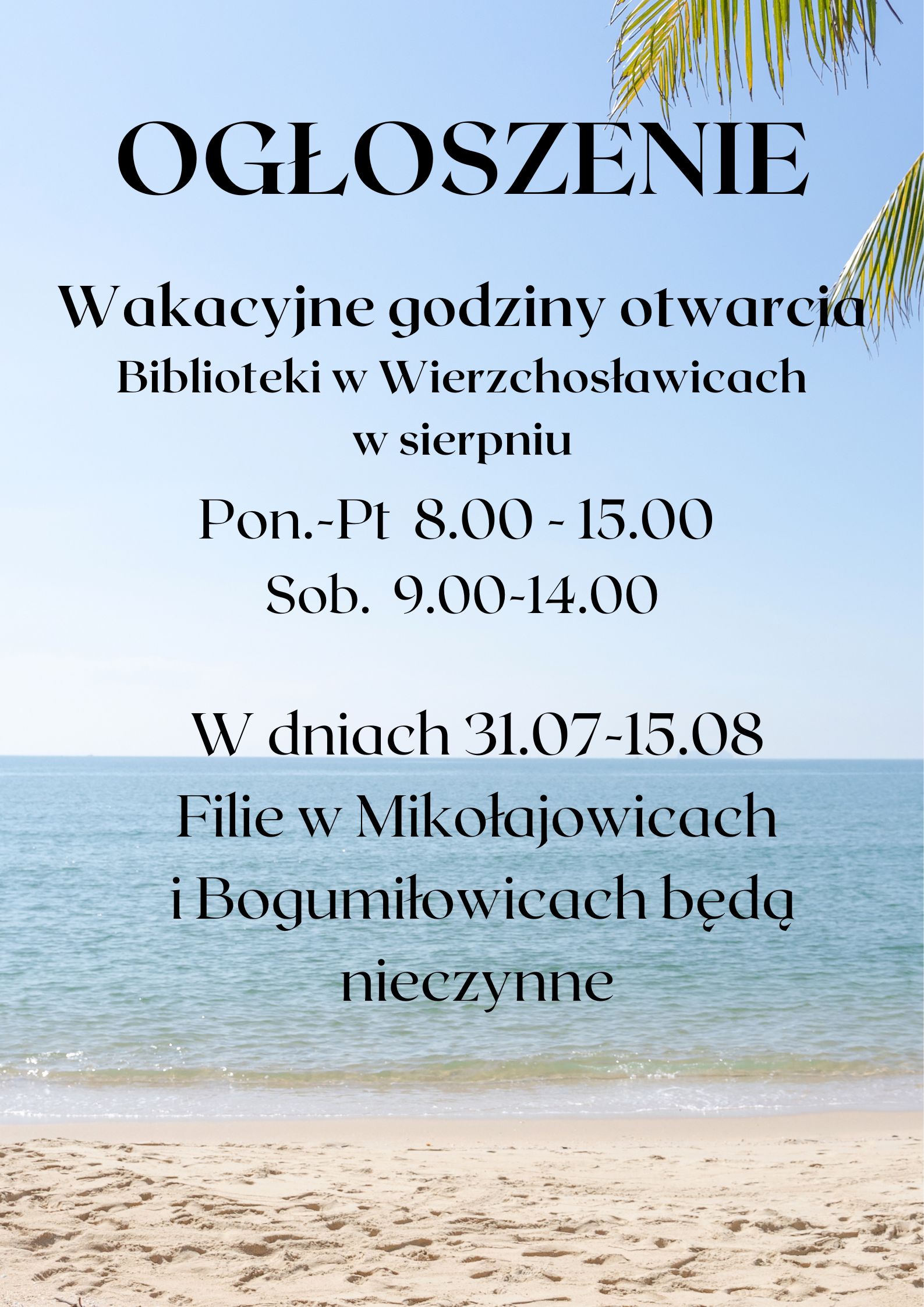 Plakat informujący o godzinach pracy biblioteki w sierpniu
