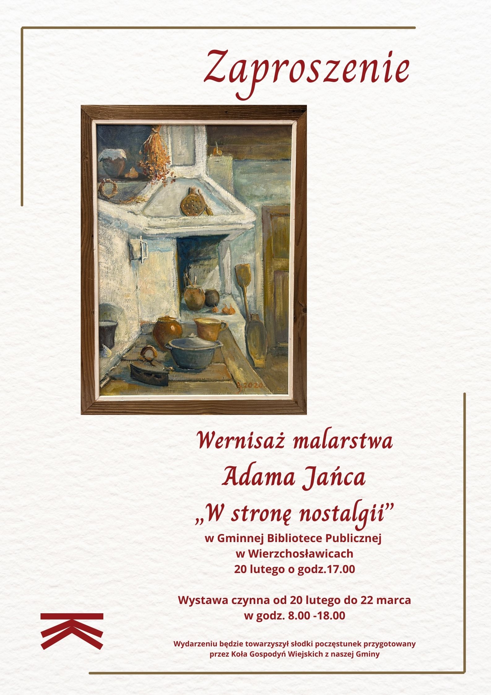 Gminna Biblioteka Publiczna im. Władysława Stanisława Reymonta w Wierzchosławicach zaprasza wszystkich mieszkańców Gminy Wierzchosławice oraz pasjonatów na Wernisaż malarstwa Adama Jańca „W stronę nostalgii”, który odbędzie się 20. lutego 2025 r. o godz. 17.00 w siedzibie biblioteki, tj. Domu Ludowym w Wierzchosławicach. Wydarzeniu będzie towarzyszył słodki poczęstunek przygotowany przez Koła Gospodyń Wiejskich z naszej Gminy.