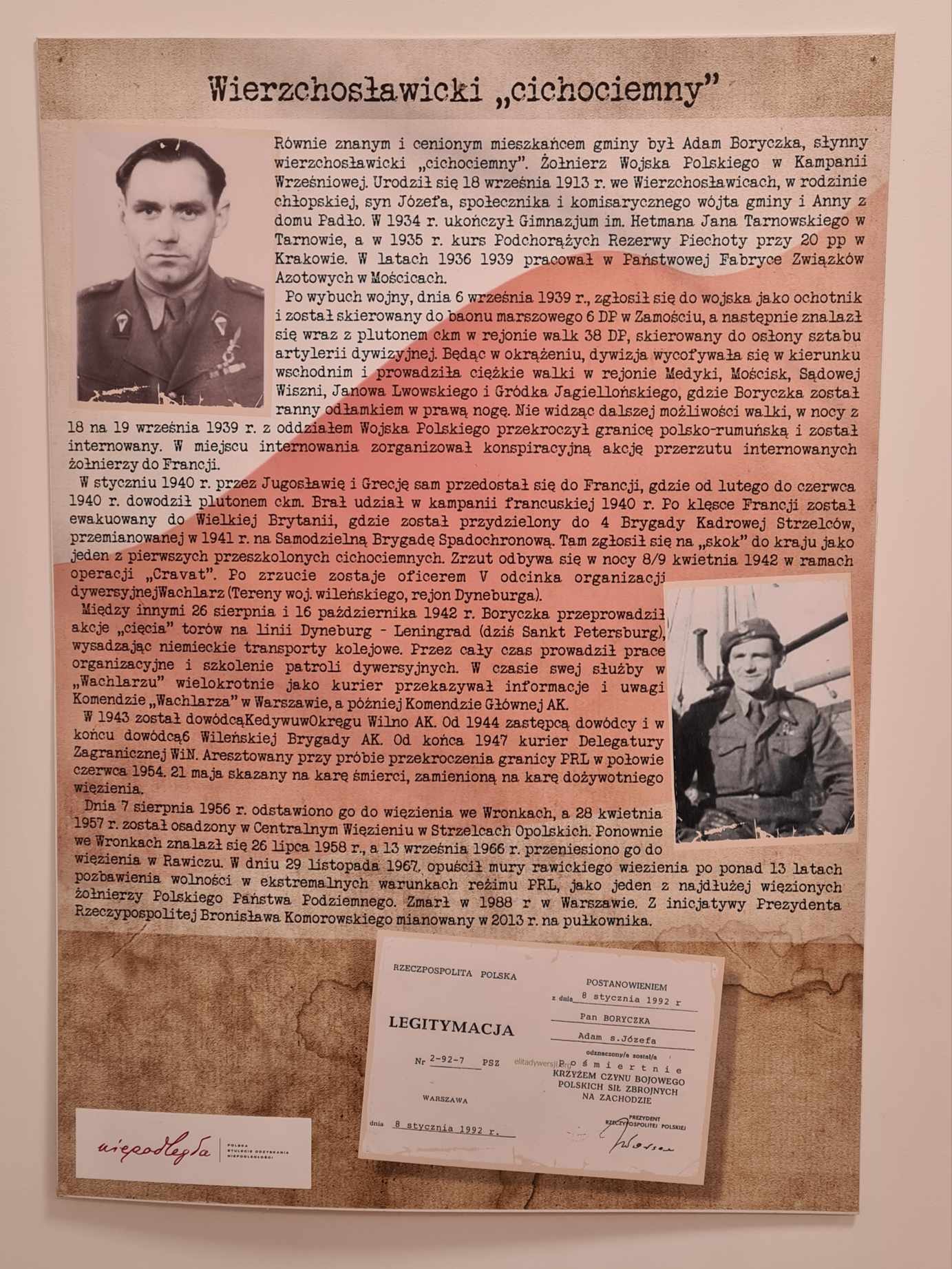 Osobny wątek wystawy poświęcono osobie wierzchosławickiego cichociemnego – pułkownika Adama Boryczko, którego barwna postać, przez lata zapomniana, obecnie wraca w annały.