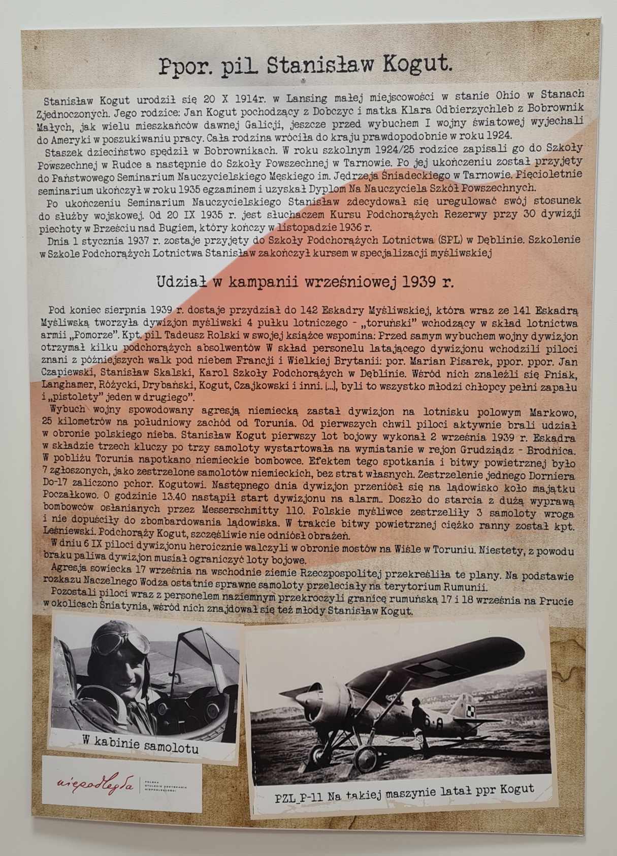 Na osobną uwagę i formę upamiętnienia zasługuje też pochodzący z Bobrownik porucznik lotnictwa Stanisław Kogut. Temu bohaterowi, dobrze zapowiadającemu się młodemu asowi polskiego lotnictwa z czasów II wojny światowej poświęcono również wątek niniejszej wystawy.