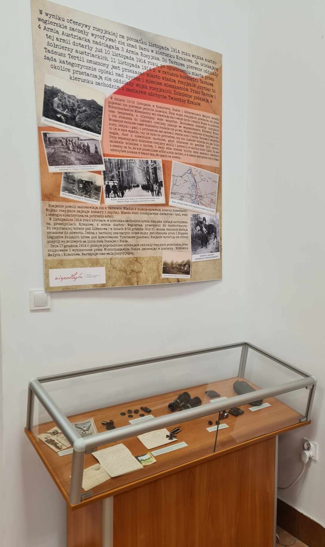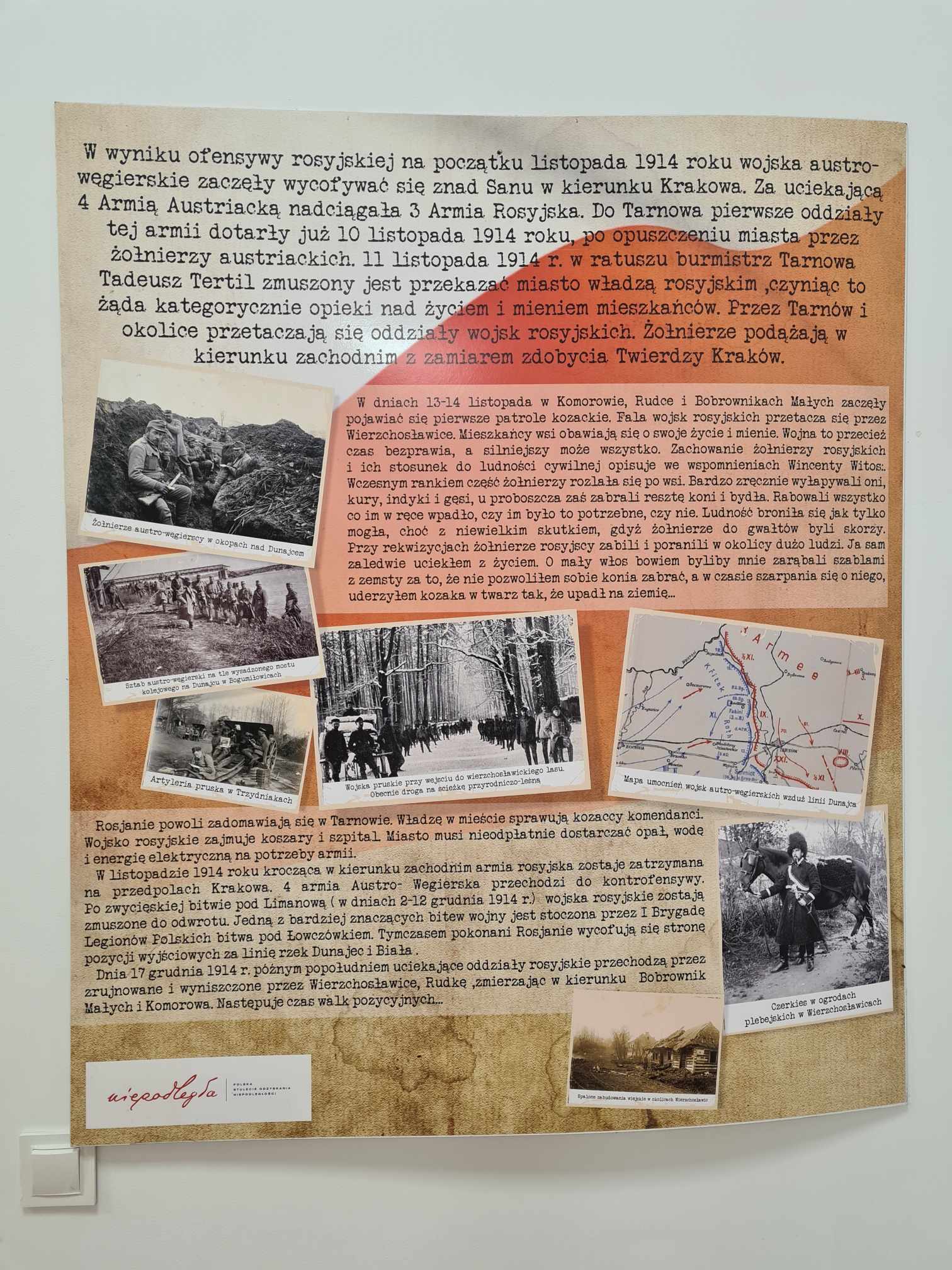 Wystawa omawia szerokie tło zdarzeń militarnych dziejących się od jesieni 1914 roku do wiosny 1915 roku, a więc do przełamania linii frontu pod Gorlicami i wyparcia Rosjan z Wierzchosławic oraz całej ziemi tarnowskiej.