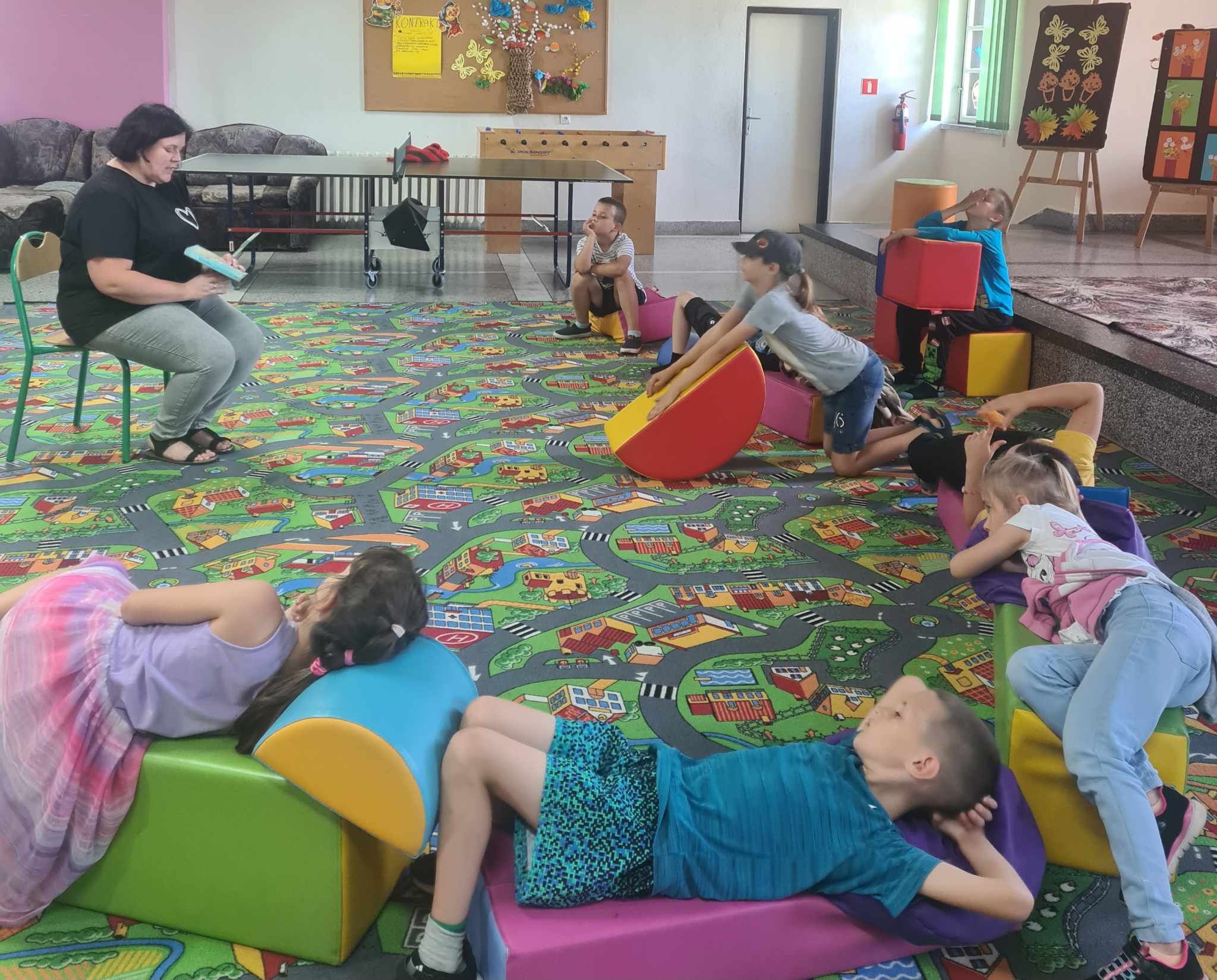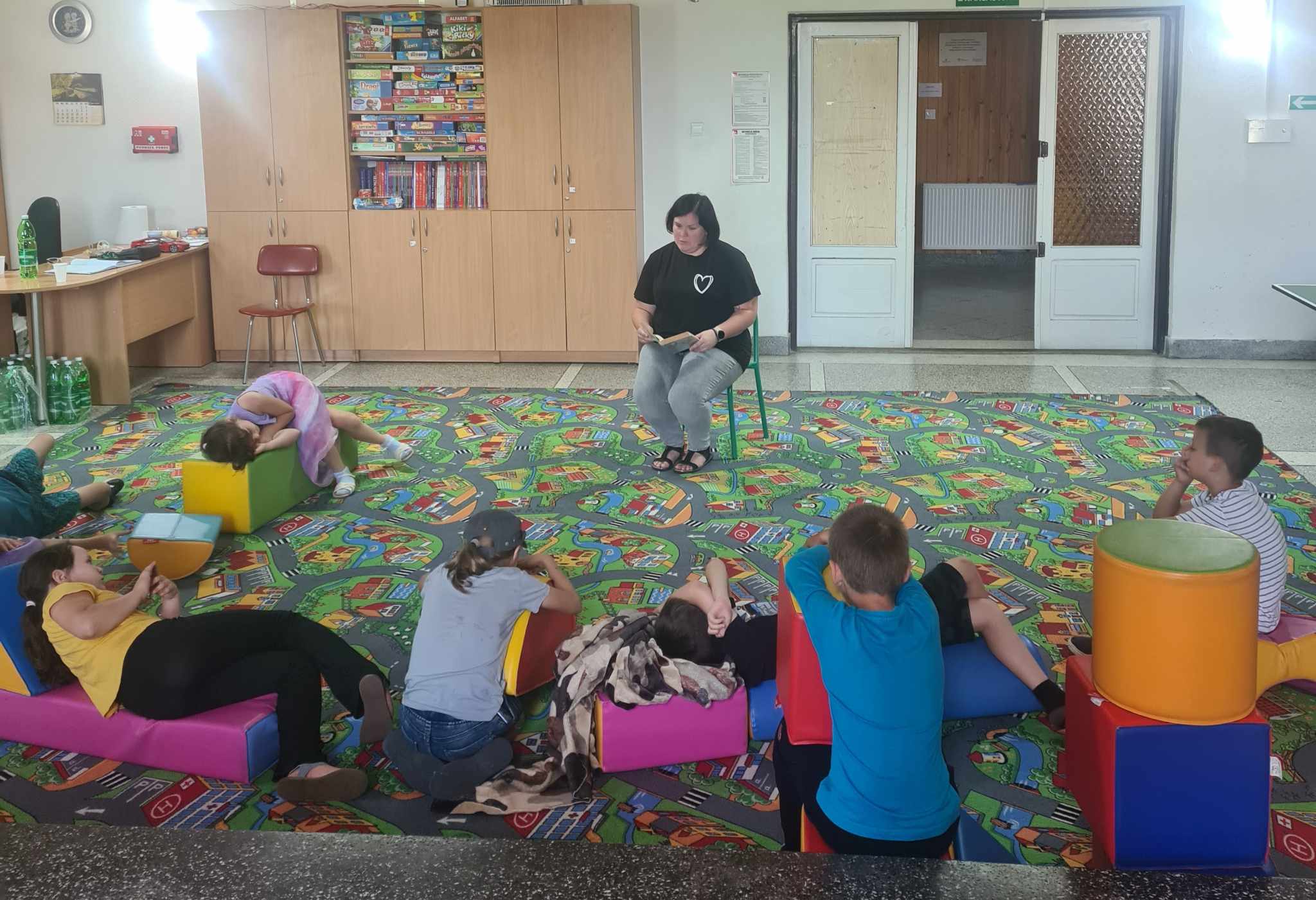 Bibliotekarka czyta dzieciom książkę. Dzieci siedzą na kolorowych pufach.   Bibliotekarka czyta dzieciom książkę. Dzieci siedzą na kolorowych pufach.