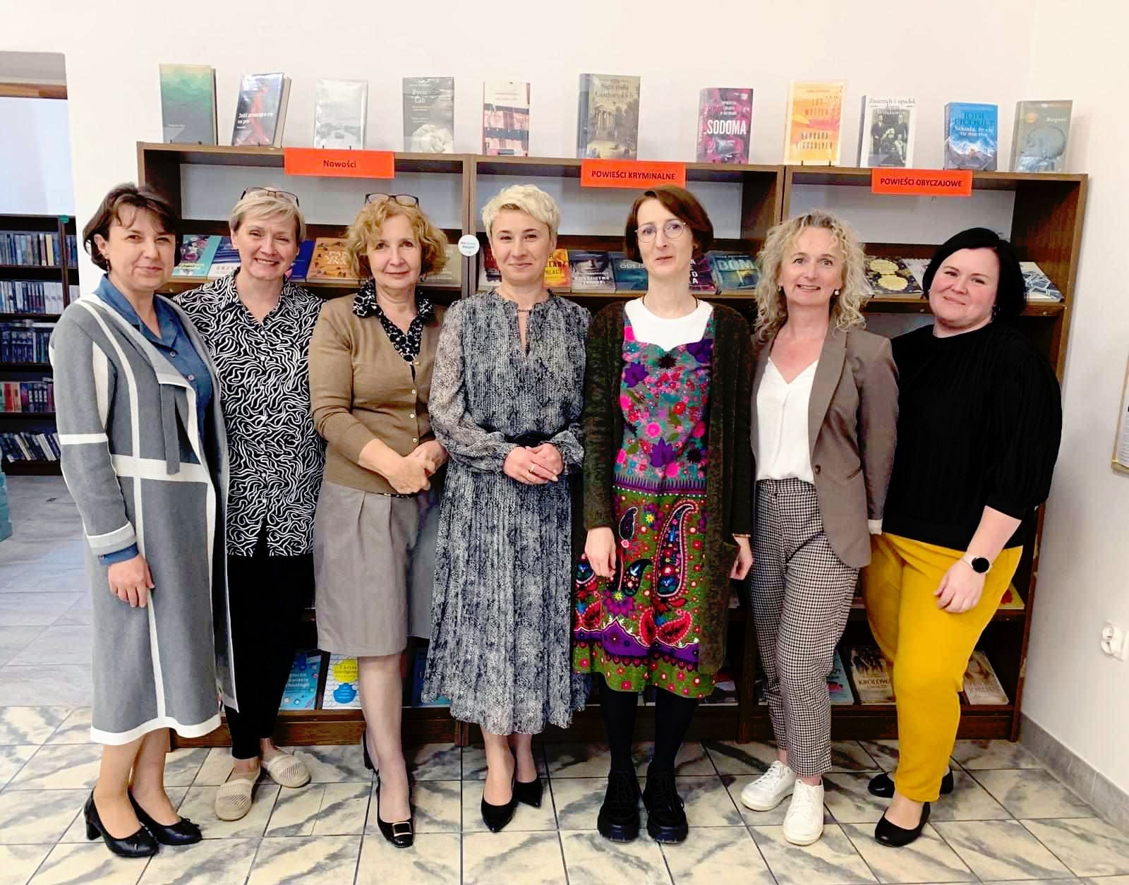 Grupa kobiet stoi przed regałem z książkami